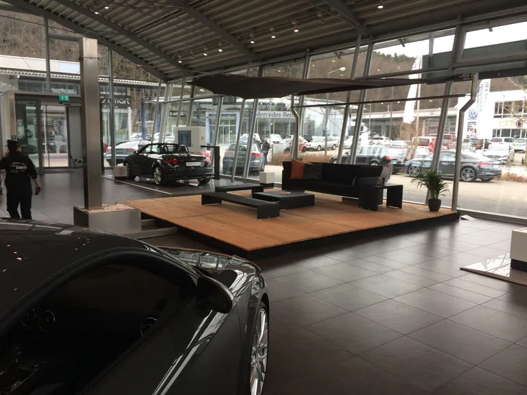 Wer so ein hochwertiges und funktionales Produkt im Angebot hat, möchte dieses potenziellen Kunden natürlich auch zeigen. Dafür nutzte Jalousien Huber die Möglichkeit, ein Mustersegel bzw. ein so genanntes Roadshow-Segel beim Hersteller auszuleihen. „Nach ein paar Überlegungen fiel uns ein Autohaus in der Region ein, für das wir öfter tätig sind“, berichtet Reiser. Nach einer kurzen Anfrage, ob Interesse bestehe, war die nächste Gelegenheit das entsprechende Event bei der Vorstellung des neuen Audi TT Roadster. Ende März 2015 bekam Jalousien Huber das Roadshow-Segel geliefert. „Wir haben es dann bei unserem Kunden mitten im Showroom eingebaut“, schildert Reiser. Schon beim Aufbau sei das Segel sehr gut angekommen.
