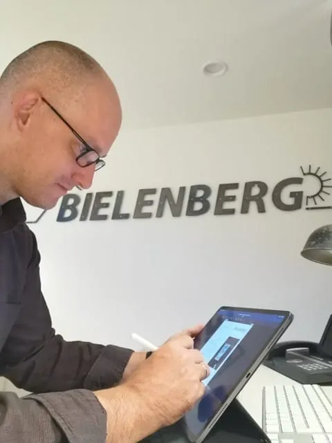 Das Lieblingswerkzeug von Peter Heinze, Leiter Kundenbetreuung und Verkaufsleiter von Bielenberg Sonnenschutz, ist ein Apple iPad Pro 12,9 Zoll inklusive der Applikation GoodNotes. "Meine Beratungen, Aufmaße und Bestellungen habe ich seinerzeit natürlich analog gelernt und bin damit gut gefahren. Die Hersteller fingen irgendwann an, Technikunterlagen und Preise als PDFs anzubieten – da begannen die Überlegungen, papierlos zu arbeiten", sagt Heinze. "So kam ich irgendwann dahin, über diese praktische Möglichkeit in meinem Arbeits-Alltag nachzudenken." Das digitale Notieren begann im Herbst 2019, wofür Heinze vorerst sein privates Tablet benutzt hat – bis sein Chef bemerkt hat: "Das funktioniert!"