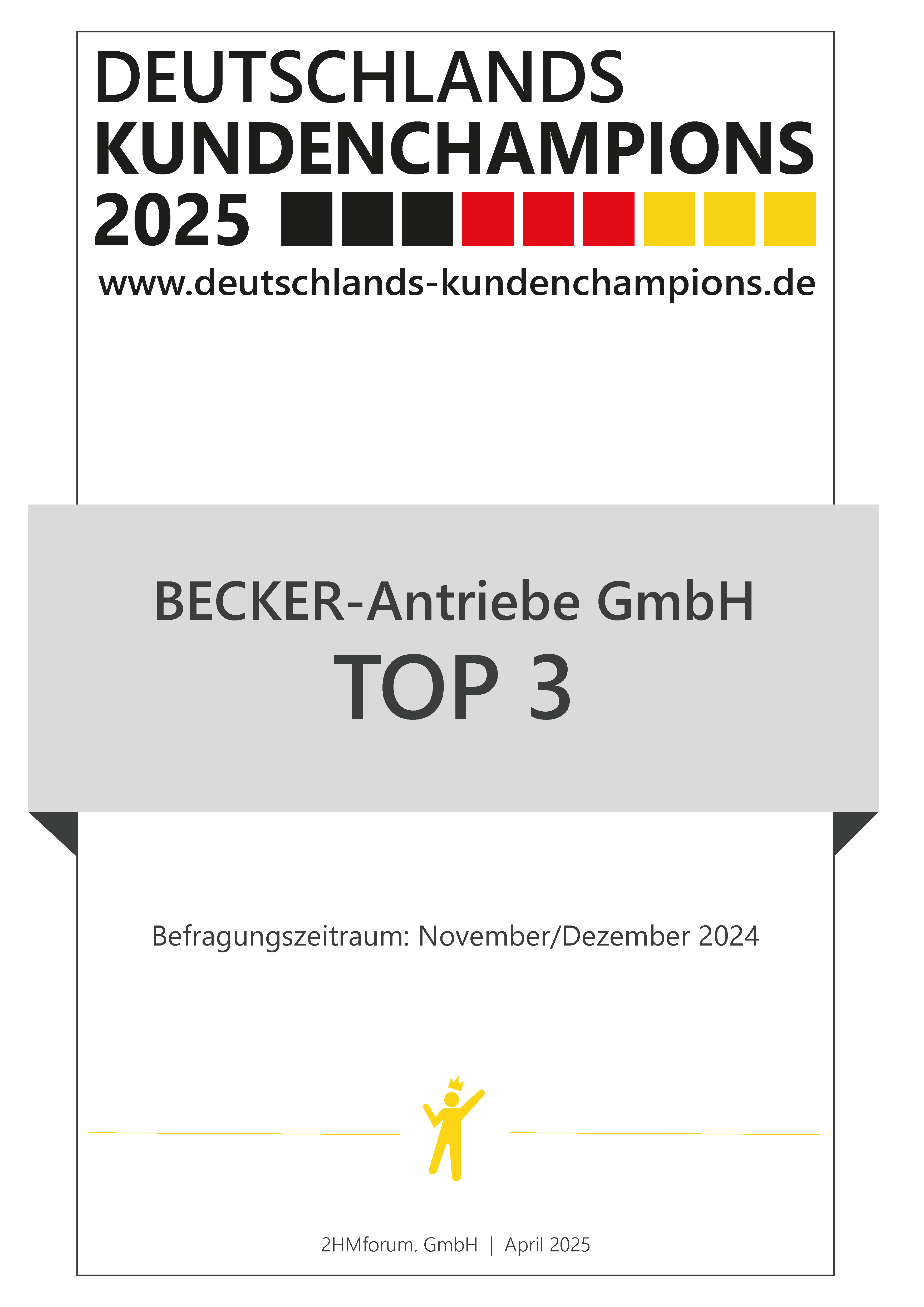 Becker-Antriebe zählt zu den kundenorientiertesten Unternehmen in Deutschland. Das Unternehmen wurde im Rahmen des Wettbewerbs Deutschlands Kundenchampions 2025 mit dem dritten Platz ausgezeichnet.
