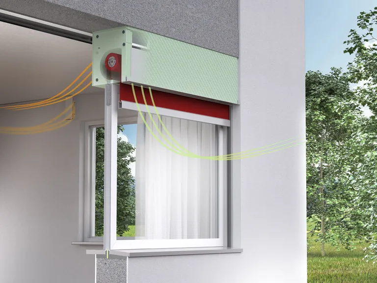 Die erforderlichen Lüftungsöffnungen im Außenbereich sind in der Kastenabschlussschiene angeordnet und stören das optische Gesamtbild nicht. Dank schlüsselfertiger Vormontage und einfacher Plug-and-Play-Verkabelung wird die Installation erleichtert und der Aufwand auf der Baustelle reduziert. Der Airfox Plus erfüllt die Anforderungen der DIN 1946-6.