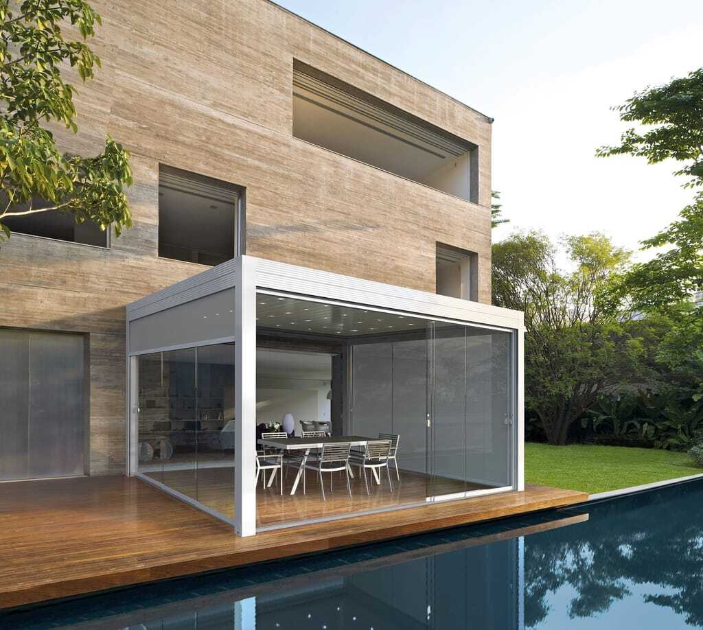 Die Pergola steht in Insel- und Wandversionen zur Verfügung, wahlweise mit seitlicher oder frontaler Ausrichtung. Die robuste Struktur besteht aus stranggepresstem, pulverbeschichtetem Aluminium und schafft nach Herstellerangaben exklusive Wintergärten, die sich dynamisch an Wetterbedingungen anpassen.