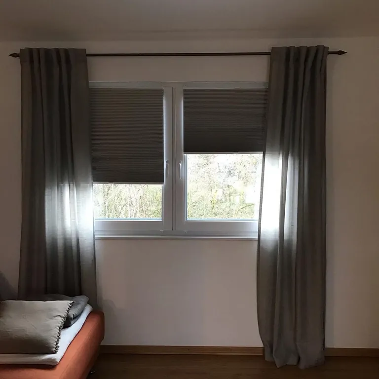 Der Kunde hat sich für helle, gecrashte, blickdichte VS2-Plissees von Saum & Viebahn entschieden, die mit einer Perlex-Beschichtung optimiert sind. Passend dazu fiel seine Wahl im Wohnzimmer auf zwei verdunkelnde, nicht gecrashte Duette-Plissees derselben Firma. Grund dafür ist die Lage der Wohnzimmerfenster, durch die besonders viel Sonnenlicht in den Raum gelangt. Zusätzlich brachte die Raumausstattermeisterin zwei gecrashte, raumhohe Stoffe aus Polyester namens Elias von Saum & Viebahn an. „Im Wohnzimmer war bereits eine Vorhangstange vorhanden, deswegen wählte ich ein Schlaufband, durch das die Stange geschoben wird. Das erzeugt einen Effekt wie bei einem Wellenvorhang“, sagt Wallner-Kandt. „Das Band ist nichts Neues und ich hatte es, ehrlich gesagt, schon fast vergessen. Deswegen war ich angenehm überrascht, wie leicht sich der Behang da durchschieben lässt.“ Da der Stoff aufliege und nicht komplett blickdicht sei, bekomme die gesamte Dekoration einen Touch von Leichtigkeit – und bilde einen Gegenpol zu den verdunkelnden Duette-Plissees, die wie auch die übrigen Plissee-Anlagen, geklemmt montiert sind.