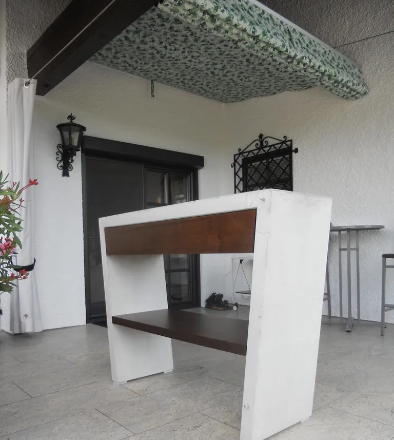 staltet, die er zusammen mit anderen Handwerkern aus seinem Netzwerk realisiert: „Zusätzlich habe ich für die Terrasse ein Möbelstück aus Beton und Holz gestaltet und