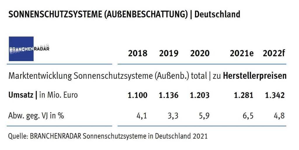 Gestützt von einer stabilen Bauwirtschaft, nahm das Wachstum am Markt für Außenbeschattung im Jahr 2020 signifikant an Fahrt auf. Laut aktuellem Branchenradar Sonnenschutzsysteme in Deutschland erhöhte sich der Herstellerumsatz um 5,9 Prozent im Vergleich zum Vorjahr: auf zirka 1,20 Milliarden Euro. Im Jahr davor lag der Anstieg noch bei plus 3,3 Prozent.