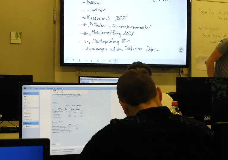 Meisterprüfung 2.0 an der Handwerkskammer Wiesbaden: Bei der theoretischen Meisterprüfung im Rollladen- und Sonnenschutztechnikerhandwerk wurde erstmals ein Handlungsfeld in digitalisierter Form geprüft. Dozent Wolfgang Löster, der die Neuerung angeregt und umgesetzt hat, erläutert Ablauf und Vorteile für Prüfer und Schüler.