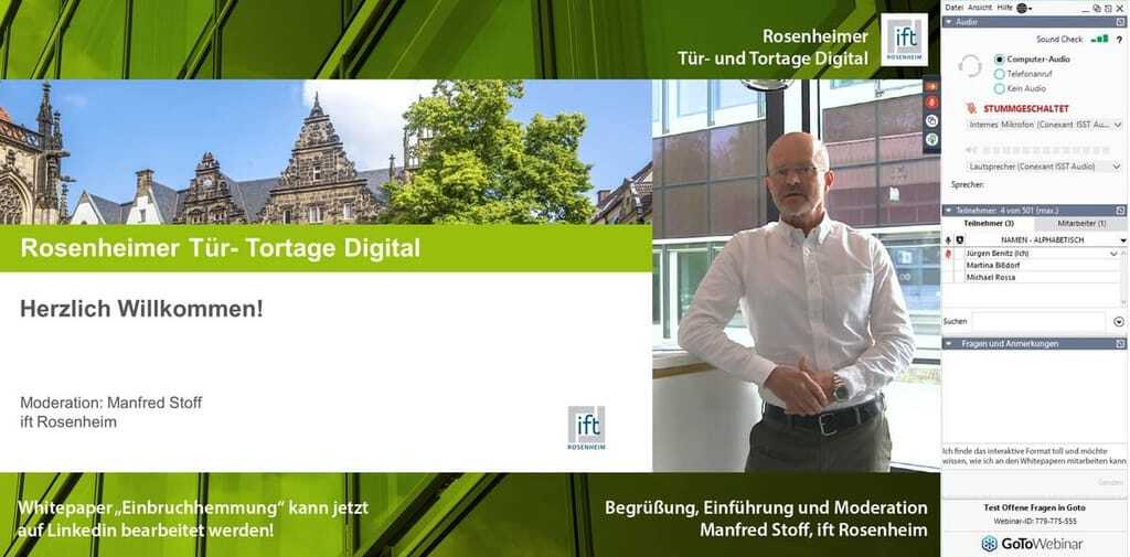 Nach der Begrüßung durch Manfred Stoff, Marketingleiter des ift, beleuchtet Institutsleiter Prof. Jörn P. Lass in seiner Eröffnungsrede das Thema "Zukunft von Türen und Toren – Orientierung in schwierigen Zeiten". Anschließend stehen die vier Schwerpunkte Sicherheit, Markt und Trends, Brandschutz sowie Tore und Schwellen auf dem Programm. Um den Spannungsbogen aufrechtzuerhalten, stellen die Referenten ihre Themen in kurzen Impulsvorträgen live vor und diskutieren sie anschließend mit dem Online-Publikum. Darüber hinaus können die Teilnehmer an der Erarbeitung von Whitepapern mitwirken, die ihnen in der täglichen Praxis mit Architekten, Planern, Handwerkern und Bauherren helfen. Auch Überraschungen wie z.B. ein Online-Cooking in der Mittagspause, sind geplant.
