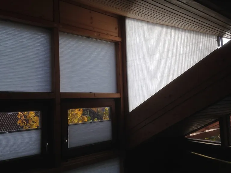 Naheliegend war daher der Kundenwunsch nach einer Verschattung. "Kann man nix machen“, sei aber die enttäuschende Antwort diverser Raumausstatter an den Kunden gewesen, berichtet Kniess. Der Grund: Die seitlichen Fenster sind dreieckig. "In senkrechter Form gibt es dafür keine Plisseeanlagen.“ Kniess löste das Problem, indem er eine dreieckige Plafondanlage aus dem Dachbereich seitlich montierte. "Der Sonnenschutz lässt sich seitlich auf- und zuziehen.“