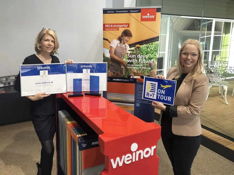 Vanessa Kunz, Kommunikationsleiterin der Messe Stuttgart (re.), übergibt Weinor-Marketingleiterin Sylvia Hendel den R+T Innovationspreis sowie den R+T Nachhaltigkeitspreis. - © Weinor