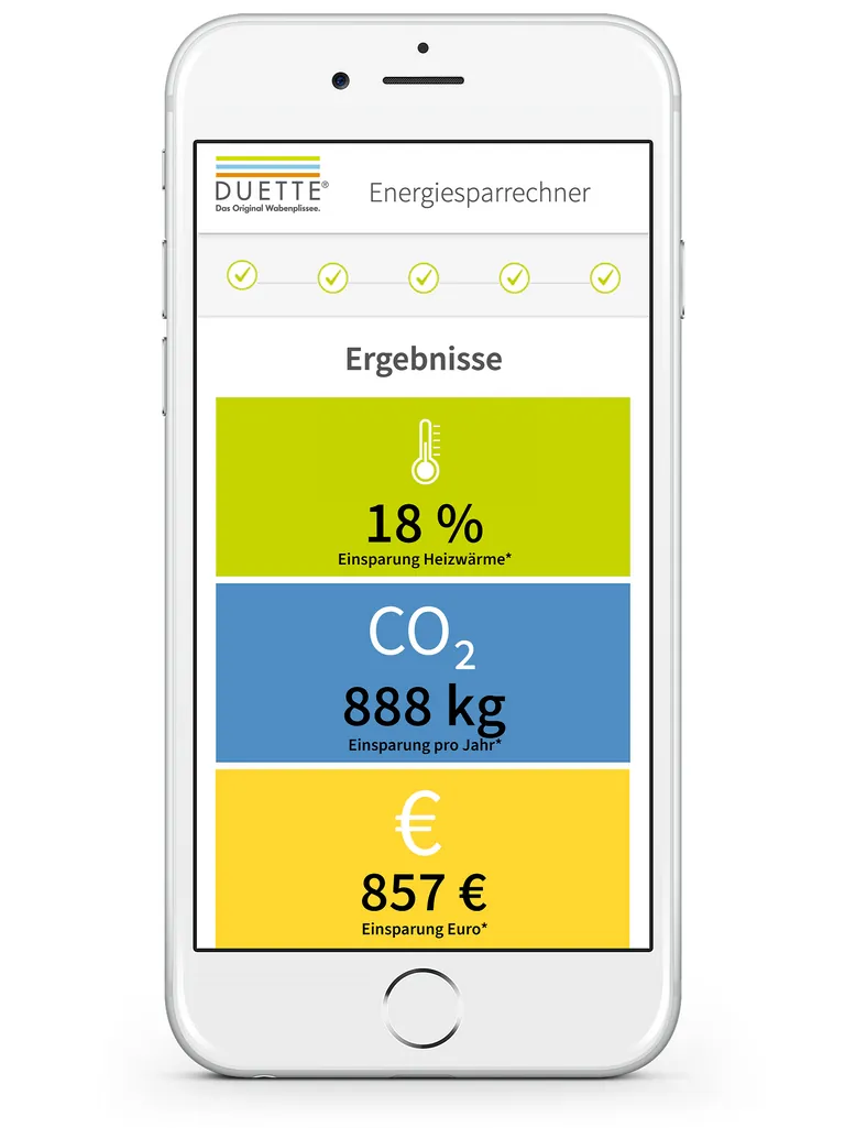 Die Sorge vor kühlen Räumen im Winter ist groß, insbesondere auch, da sich energieeffiziente Maßnahmen oft nicht zeitnah realisieren lassen. Mit einer Anzeigenkampagne in Wohnzeitschriften wie auch in großen Publikumszeitschriften kommuniziert Duette plakativ den Vorteil "Heizenergie sparen" von Duette Wabenplissee. Ganz neu: Der Energiesparrechner ermittelt das individuelle Einsparpotential.