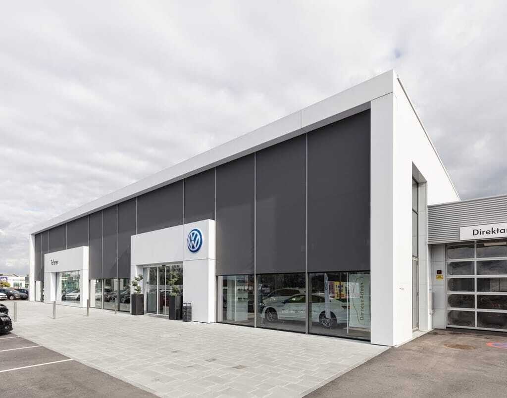 Das VW-Autohaus ist mit Sonnenschutz von Renson ausgestattet.