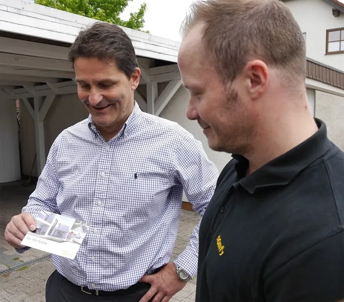 Thomas Kneuer (li.) freute sich im Gespräch mit einem Somfy-Servicetechniker über die schnelle Installation seiner Gefahrenwarnanlage. - © Somfy