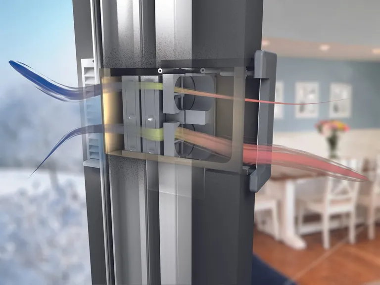 In einem dichten Gebäude mit entsprechend leistungsfähig eingebauten Fenstern inklusive Sicht- und Sonnenschutz spielt die Luftqualität in Innenräumen die entscheidende Rolle für die Wohnqualität. Um die Lüftungsleistung nach der Lüftungsnorm DIN 1946-6 sicherzustellen, hat Beck+Heun das dezentrale Lüftungssystem Airfox in sein Montagesystem integriert. In der Laibung platziert, saugt ein Lüfter verbrauchte Raumluft an und führt sie nach außen ab. Ein Aluminium-Wärmespeicher nimmt dabei die Wärme der Raumluft auf.