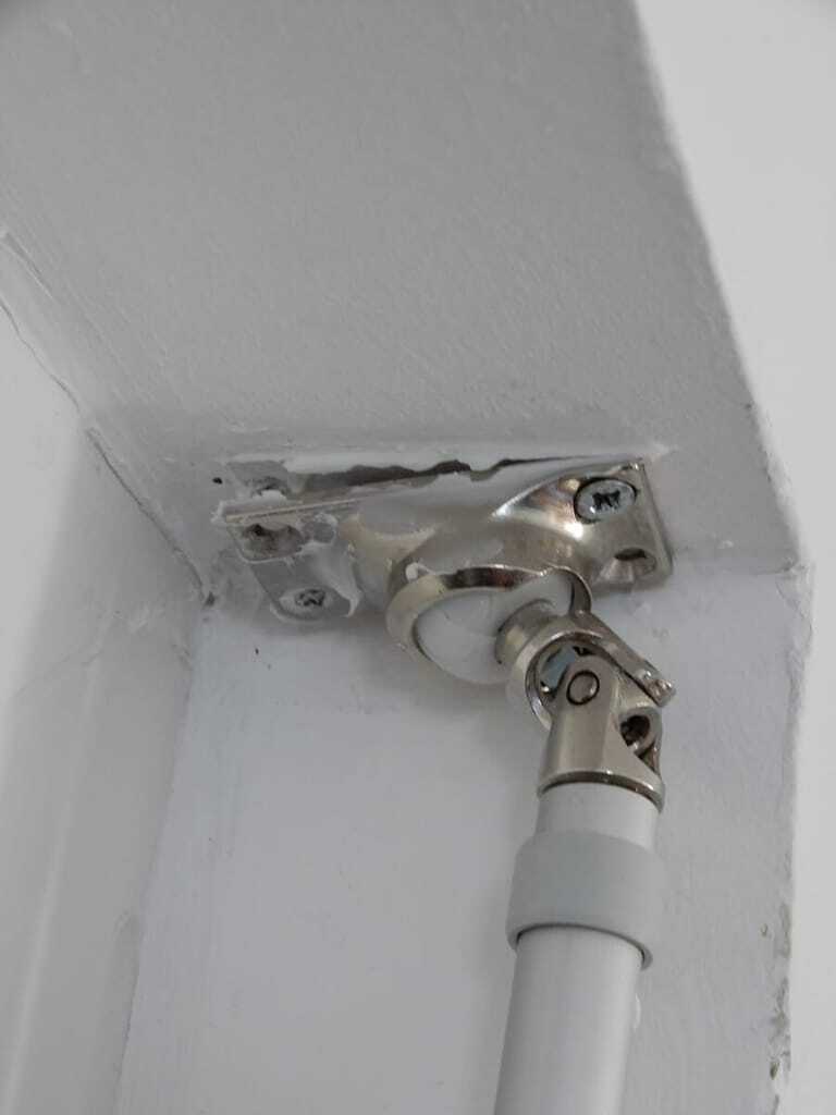 Wie der Sachverständige feststellte, sind die fensternahen Schrauben komplett ohne Halt, da die Gipskartonplatte hier keine Unterkonstruktion hat. Die Schrauben zur Raumseite hin sind teilweise in der darunterliegenden Holzkonstruktion verankert. Die Folge: Durch die mechanische Belastung beim Kurbeln im Zusammenspiel mit der mangelhaften Befestigung sind die Gelenkplatten schräg nach unten geneigt und es ist nur eine Frage der Zeit, bis alle Schrauben den Dienst quittieren. Im Bad und in der Dusche, wo die Laibung gefliest ist, sind die Gelenkplatten indes überhaupt nicht befestigt. Beim Fenster in der Dusche waren mehrere Bohrlöcher (Fehlbohrungen) in verschiedenen Winkeln vorzufinden.