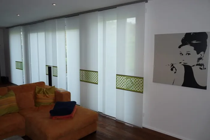 Zum Einsatz kommen Schiebevorhänge von Art of Blinds. Für Helligkeit und Transparenz sorgt ein weißer Stoff. Ein schmales Segment in grüner Farbe mit Schnittmustern, so genannten Laser-Cut-Motiven, unterbricht die weiße Fläche. „Die Segmente lassen sich variabel in Höhe, Breite und Bemusterung zusammenstellen“, erklärt Schrempp. „Über Aluminiumleisten sind diese mit dem restlichen Stoff verbunden.“ Daraus ergeben sich viele Variationsmöglichkeiten. In diesem Fall harmoniert die grüne Farbe des Bands mit dem rustikalen Holzboden des Anbaus. Insgesamt besteht der Flächenvorhang an der großen Fensterfront aus zwölf Paneelen. Verbunden sind die einzelnen Elemente nicht miteinander. „Der Kunde wollte hier flexibel sein und die Paneele jeweils einzeln hin- und herschieben können.“