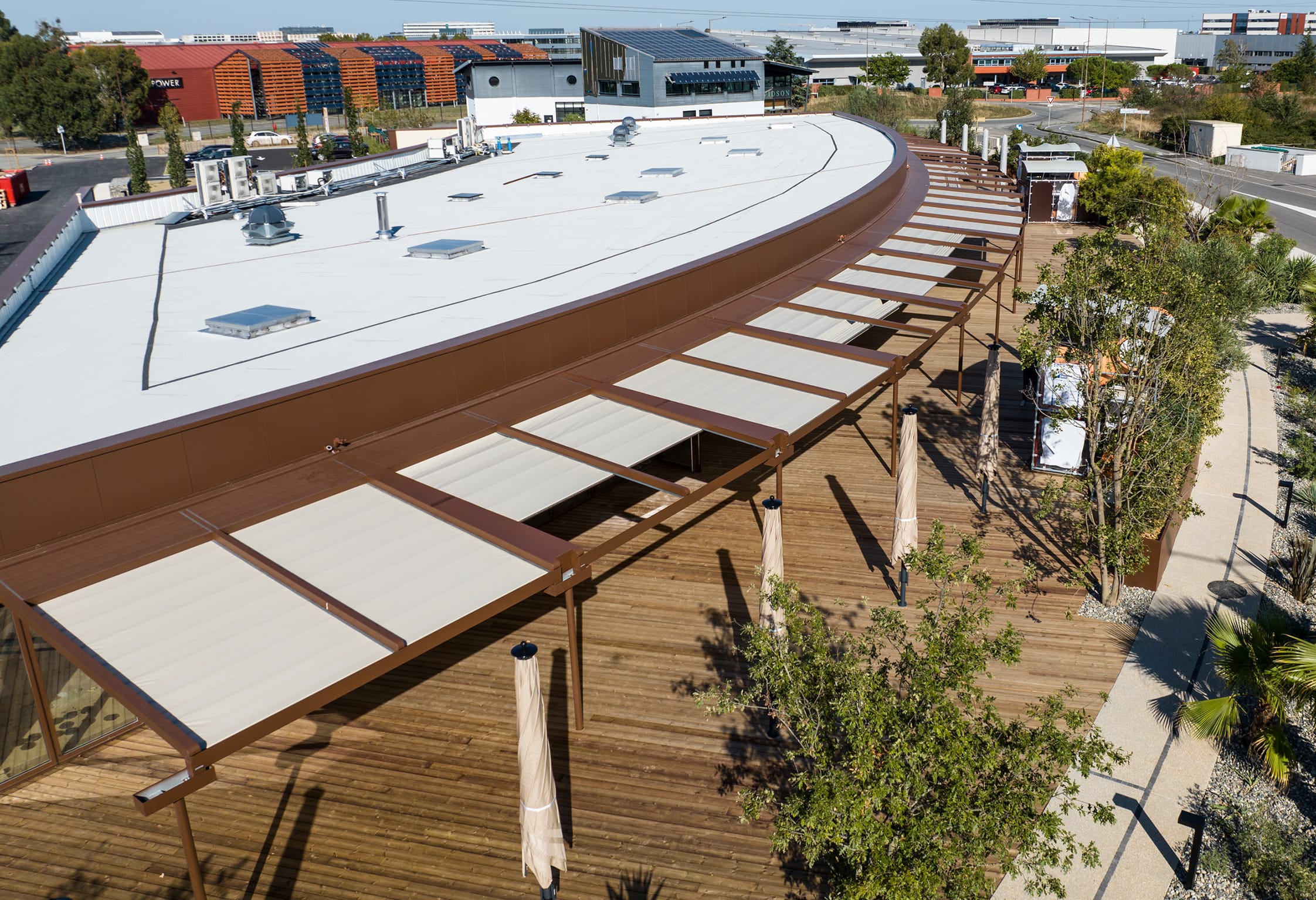 "Der neue Gebäudekomplex auf dem Boulevard de l'Europe grenzt mit seiner bogenförmigen Glasfront an die Außenterrasse. Unser Fachpartner vor Ort hatte den Auftrag, diese mit unserem System Pergola Stretch zu beschatten,“ sagt Rebecca Dick, Vertriebsleiterin für Frankreich bei Markilux.