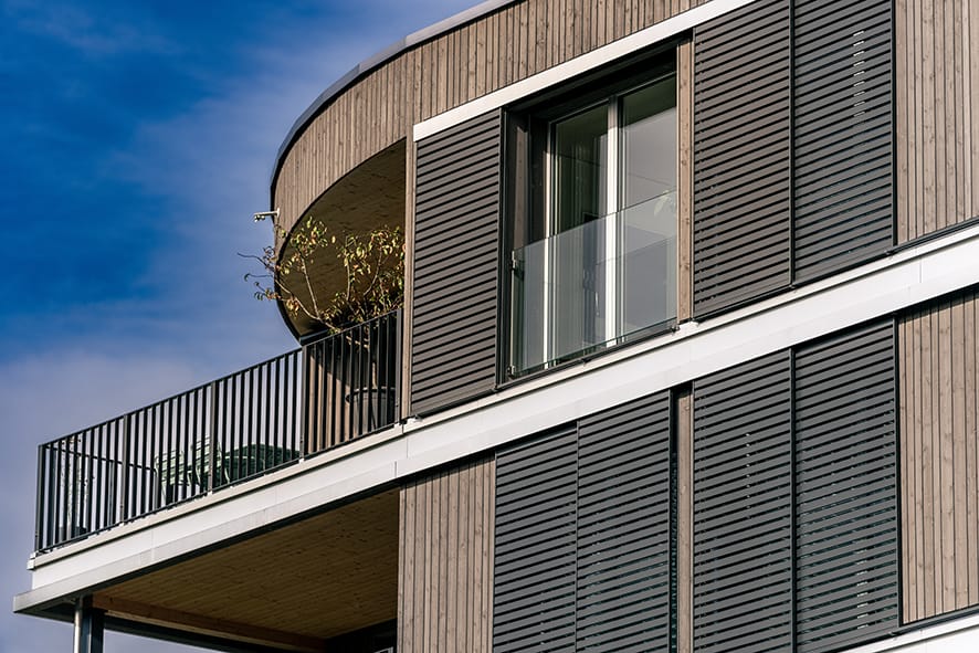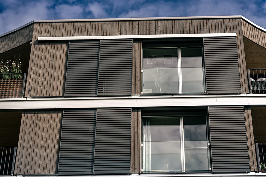 © EhretFensterläden haben in der Architektur eine jahrtausendelange Tradition. Seit einigen Jahren erleben sie im Rahmen der Klimadiskussion eine Renaissance. Wie sie für mehr Energieeffizienz, thermischen Komfort und Ästhetik zusammenwirken, zeigt das Minergie-P-Projekt Sunnehof im schweizerischen Fällanden. Bauherrin des sechsstöckigen Mehrfamilienhauses mit 42 Wohnungen war Fokus Immobilien. Die insgesamt 168 Aluminium-Schiebeläden lieferte Ehret. -