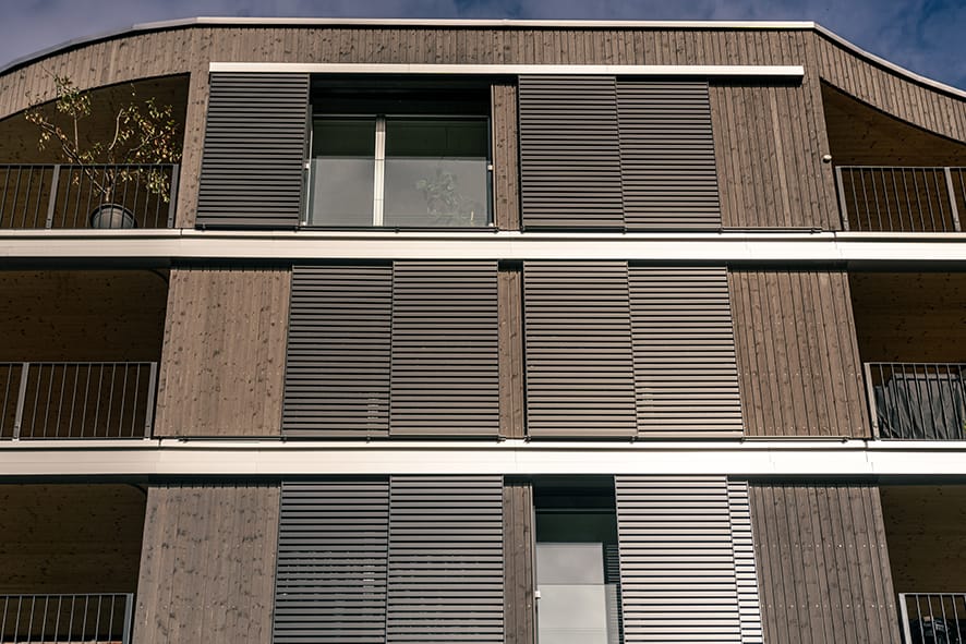 © EhretJeder Funkmotor einzeln programmiert, um Überlagerungen und Störungen zwischen den Wohnungen zu vermeiden. Ein weiterer Vorteil des außenliegenden Schiebeladens gegenüber einem Rollladen betrifft ebenfalls die thermische Isolierung der Fassade. Da das Mauerwerk nicht verjüngt werden muss, bleiben die Wärmedämmwerte an der gesamten Holzfassade gleich.