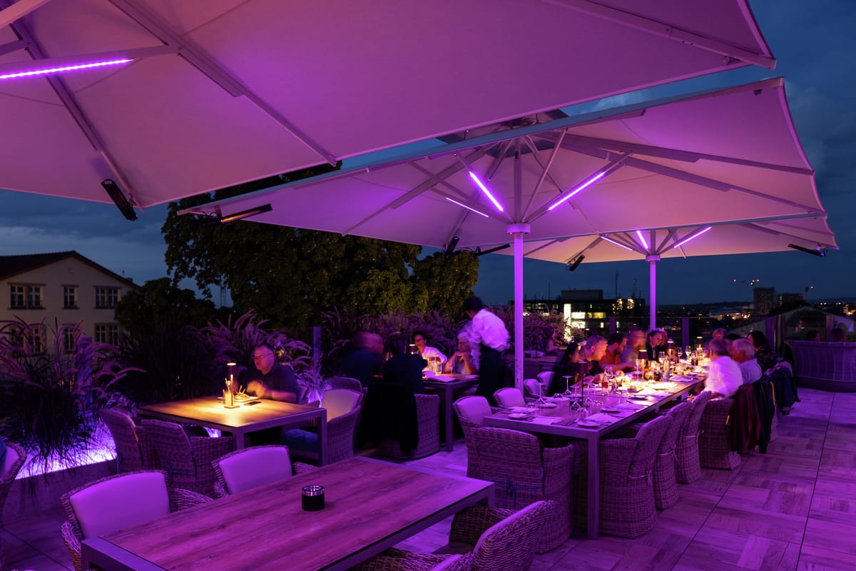 © CaravitaAls Besonderheit wurden die LED-Streifen auch mit warmweißem Licht ausgestattet. Bei direkter Beleuchtung strahlt ein Lichtkegel nach unten, wo die Gäste sitzen. Eine indirekte Beleuchtung strahlt Richtung Dach des Schirms und sorgt so für eine angenehme Atmosphäre. -