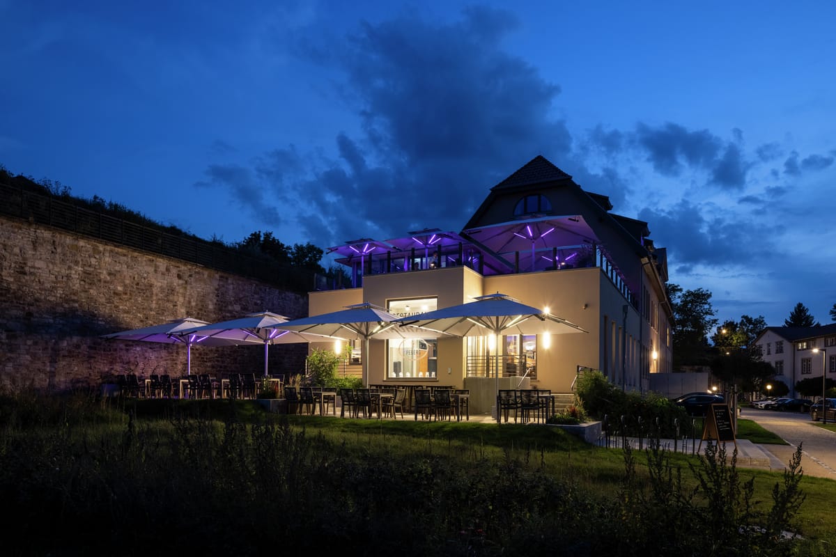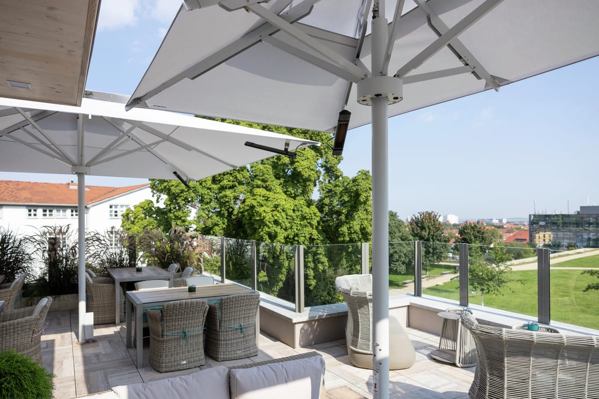 © CaravitaHochwertige Sonnenschirme von Caravita sorgen auf der Terrasse des Hotels auf dem Petersberg in Erfurt, Das Kehrs, für eine gemütliche Wohlfühlatmosphäre. -