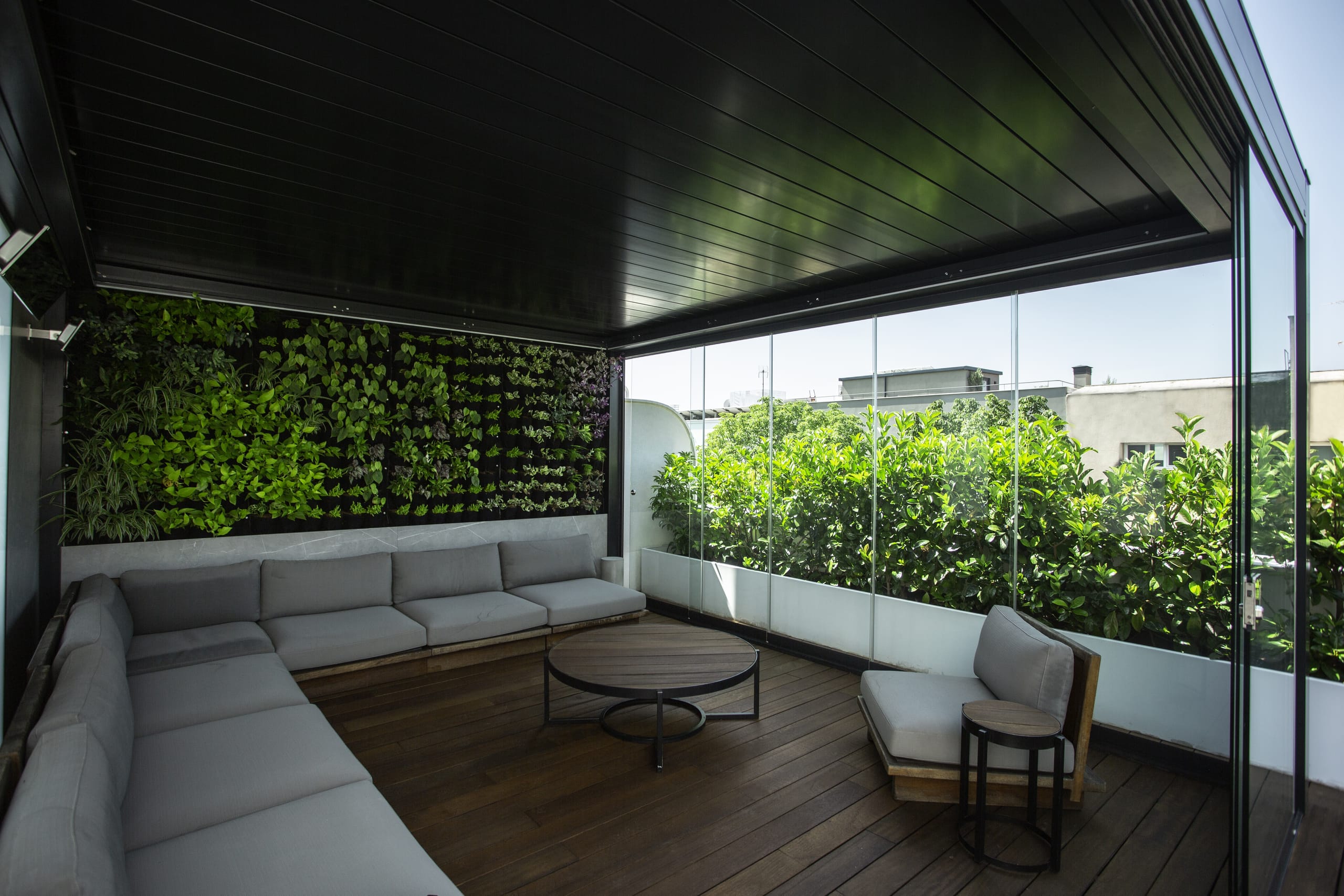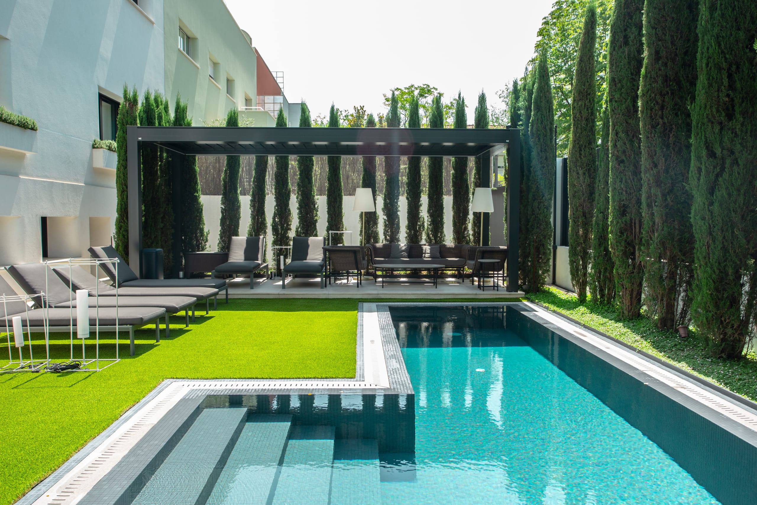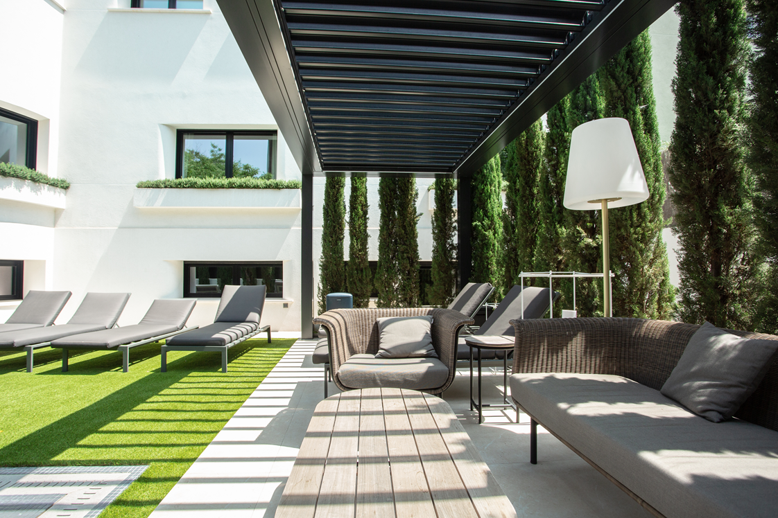 © KEDas Projekt beinhaltete die harmonische Integration zweier bioklimatischer Pergolen. Auf der einen Seite steht Kedry Skylife mit aufschiebbaren, beweglichen Lamellen, die Lichtintensität und Belüftung regulieren können. Das innovative System ermöglicht es, mit nur einer Bewegung die Lamellen zu justieren, um thermische und lichttechnische Kontrolle auf höchstem Niveau zu erreichen. -