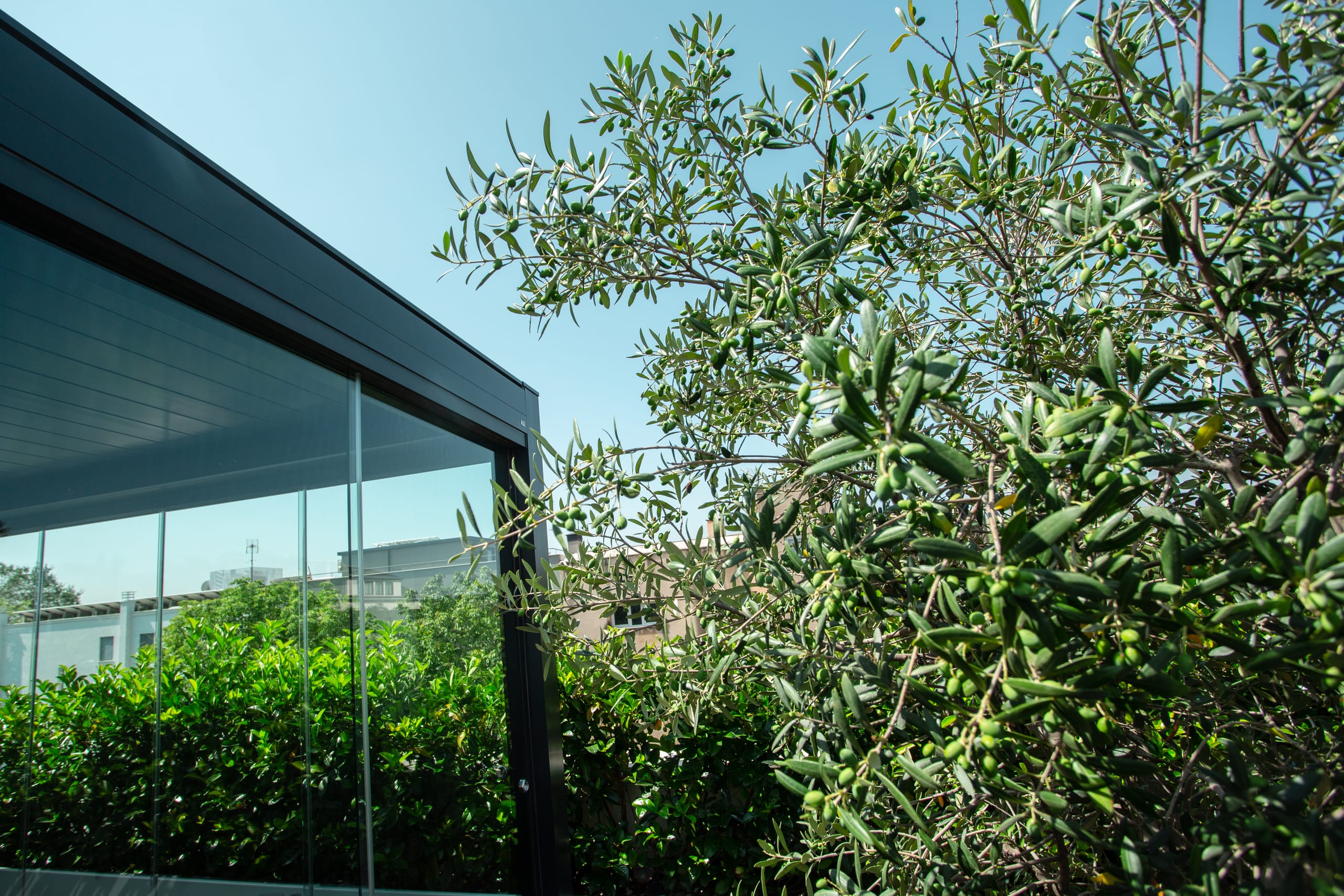 © KEErgänzt werden die Pergolen durch Line Glass Schiebefenster, die einen vollständig verglasten Effekt erzeugen und die Szenografie der Installation unterstreichen. Das Schließsystem mit auf Schienen laufenden Glasflächen kommt ohne umlaufende Rahmen aus, ist einfach zu installieren und ermöglicht hohe Gestaltungsfreiheit und Funktionalität. -