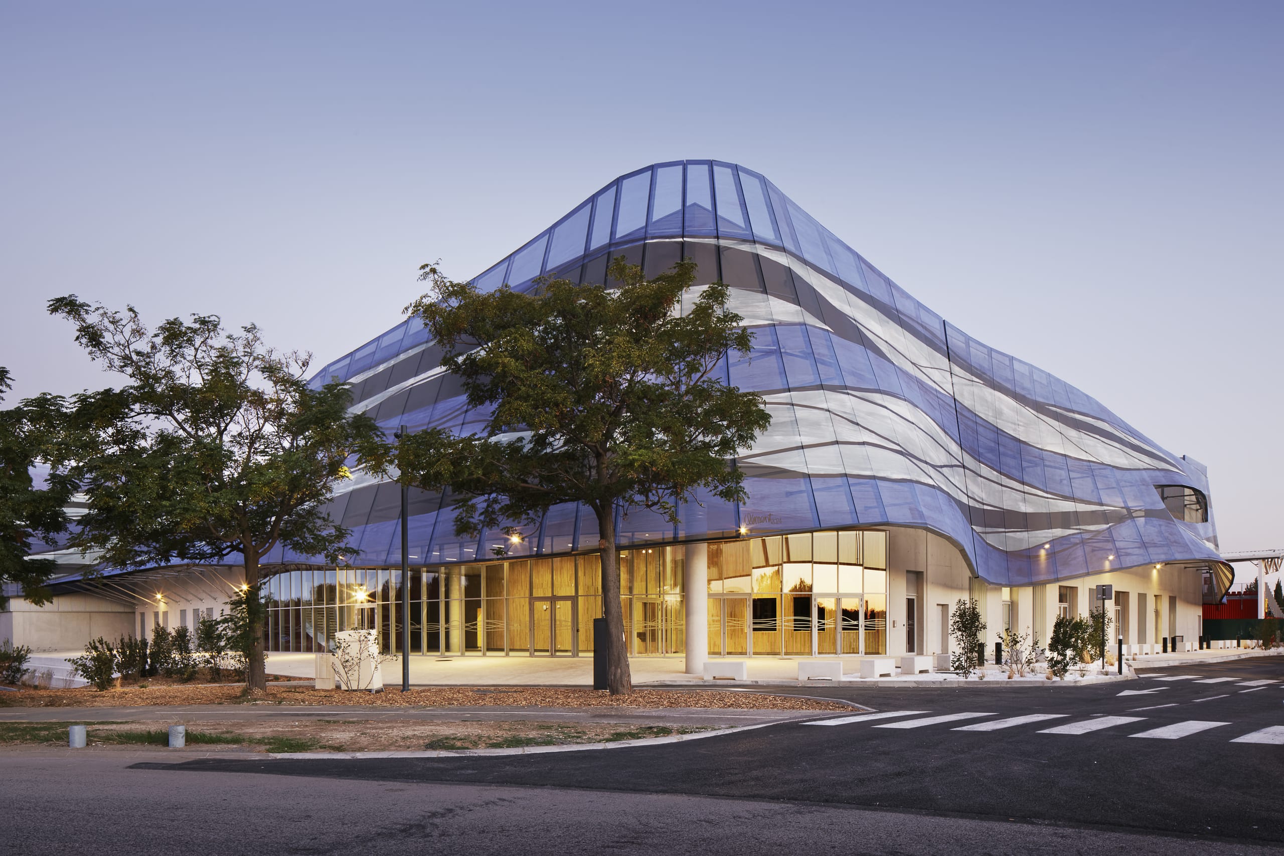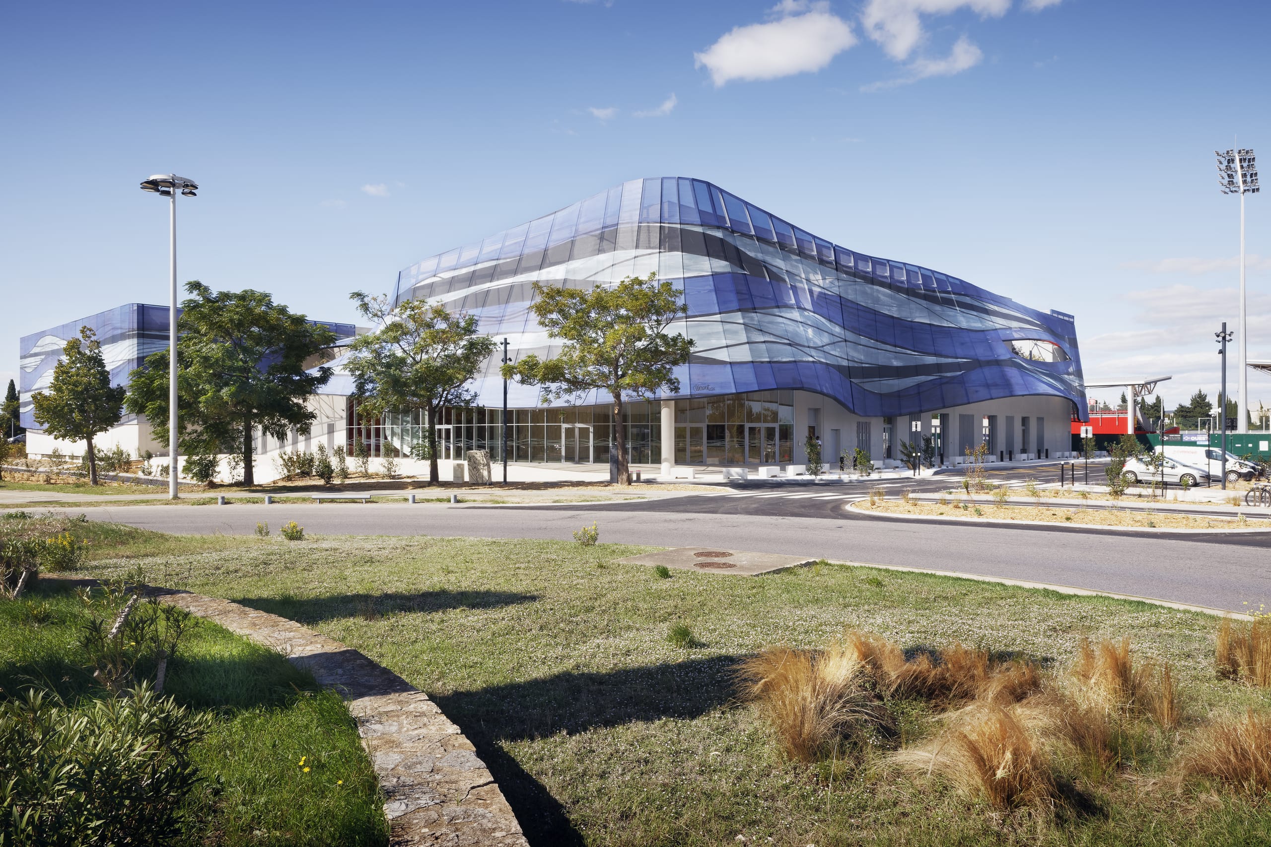 Die neue Sporthalle von Nîmes vereint eine expressive Architektur, Nachhaltigkeit und Funktionalität. Entworfen von den Ateliers A+, schafft das ambitionierte Projekt ein Zentrum des Sports und der Begegnung für 18 Sportvereine mit einer Gesamtkapazität von 2.500 Personen. Abgeleitet von der historischen Bedeutung von Nîmes als ehemaliges Zentrum der französischen Textilindustrie, wurde die Gebäudehülle in Form einer Textilfassade mit kunstvoll drapierten Bahnen um die kubisch geformten Sporthallen umgesetzt.
