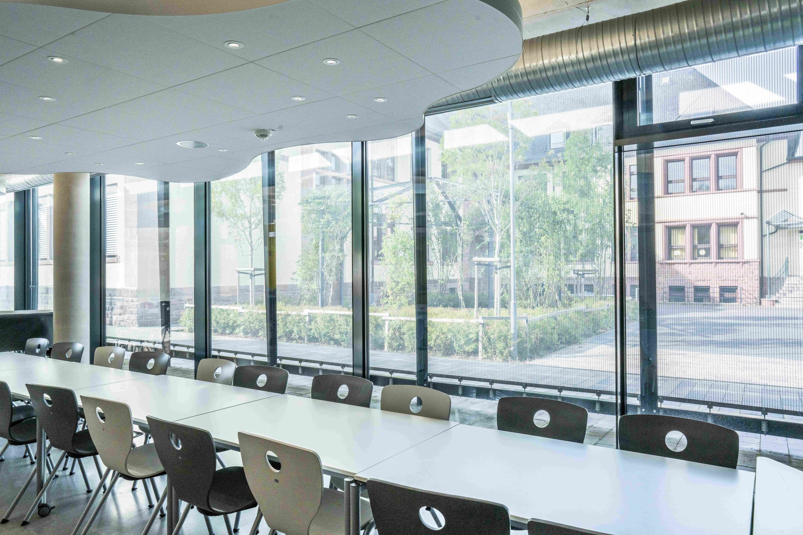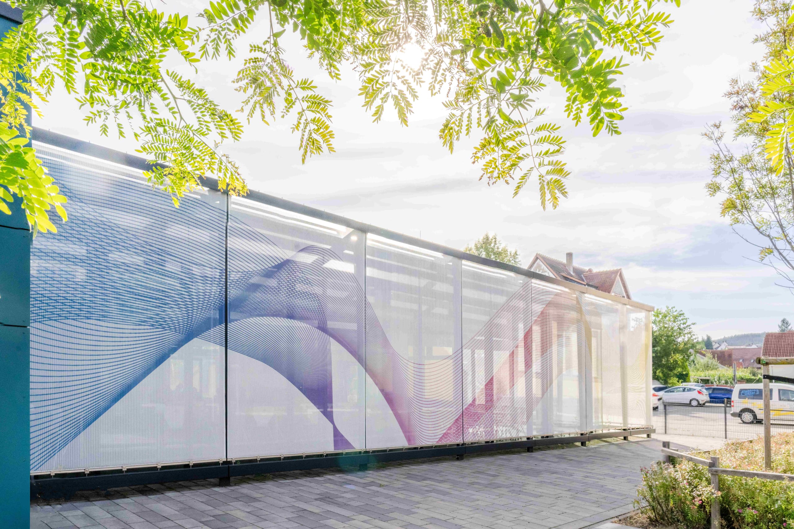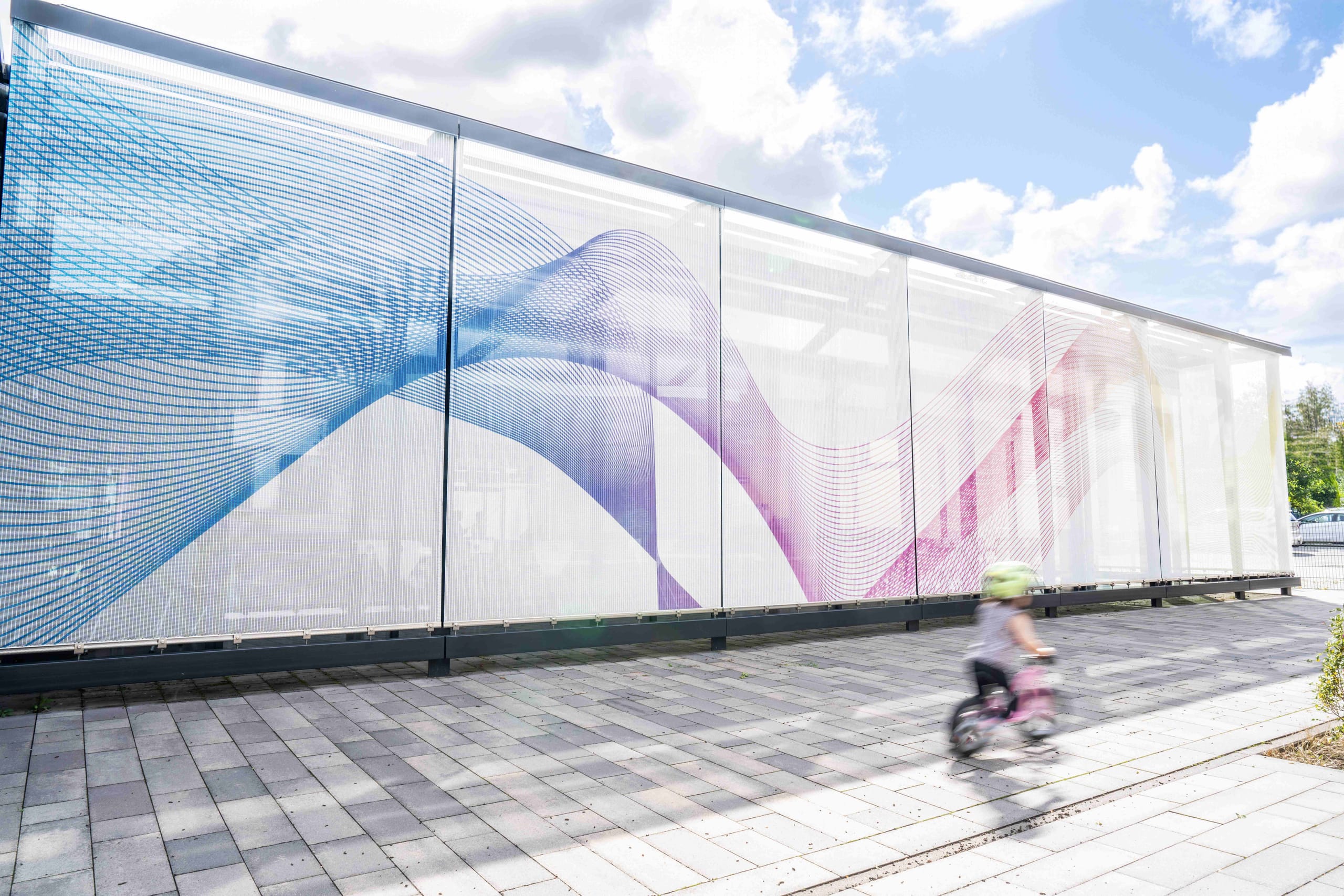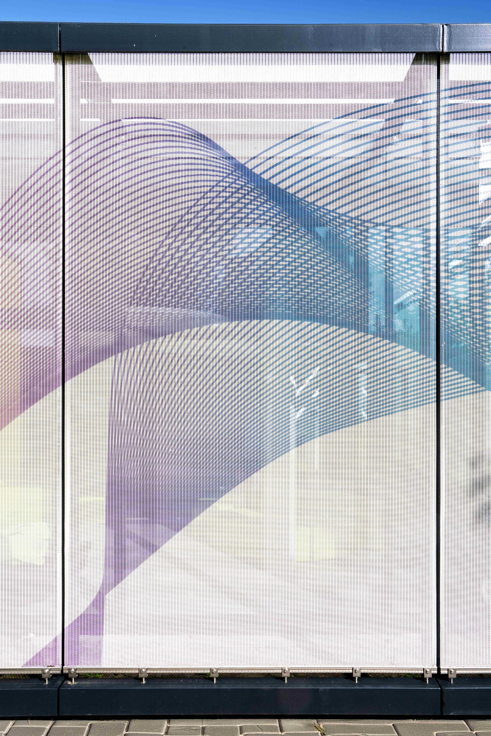 © Felicitas von LutzauDie Gewebefassade der Schulmensa beeindruckt durch lebendige, geschwungene Farbverläufe, die mithilfe von Digitaldrucktechnik auf die einzelnen Edelstahlgewebe-Elemente aufgebracht wurden. Diese farbenfrohe Fassadenverkleidung hat nicht nur einen ästhetischen Wert, sondern erfüllt auch die Funktion eines zeitgemäßen Sonnenschutzes. -
