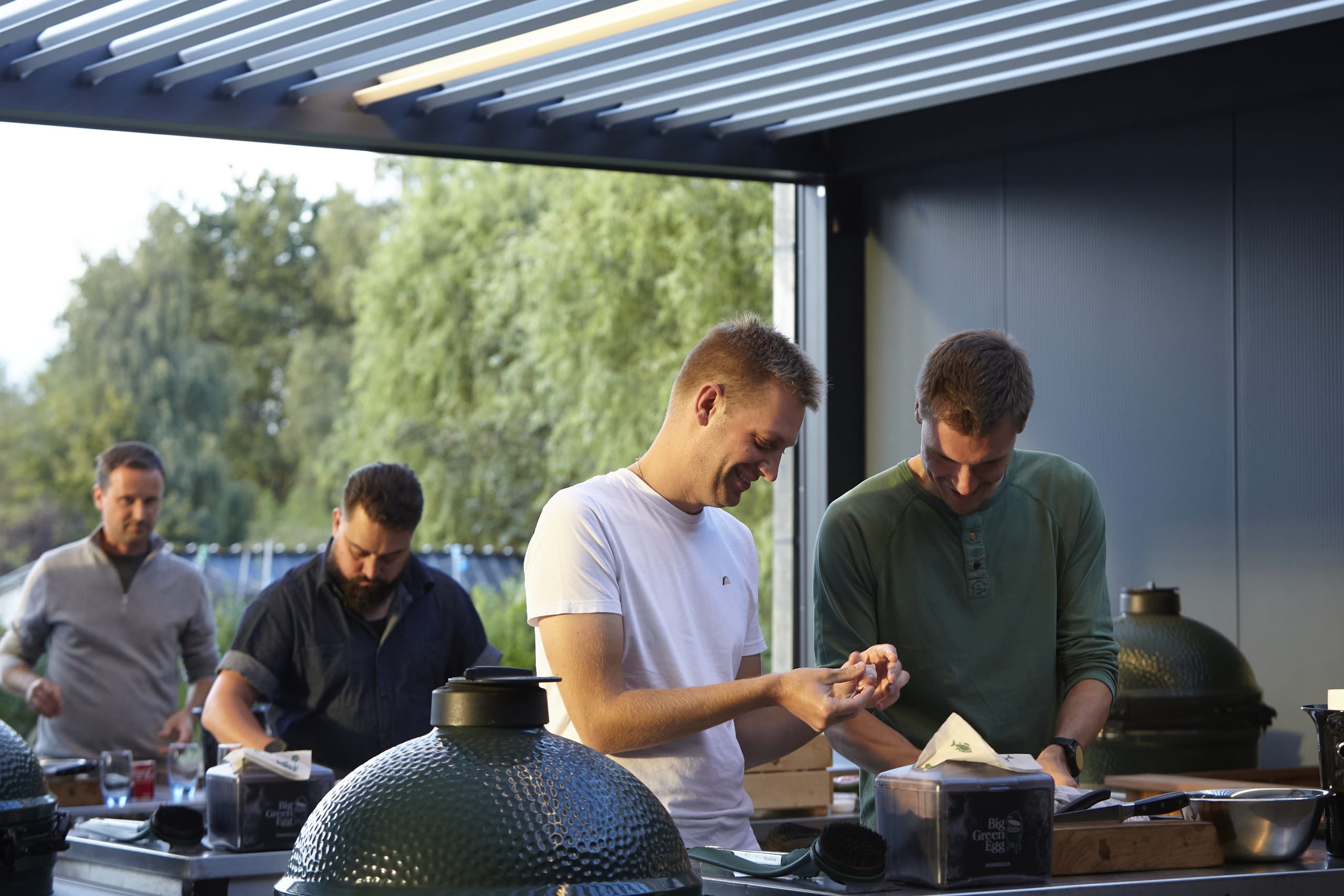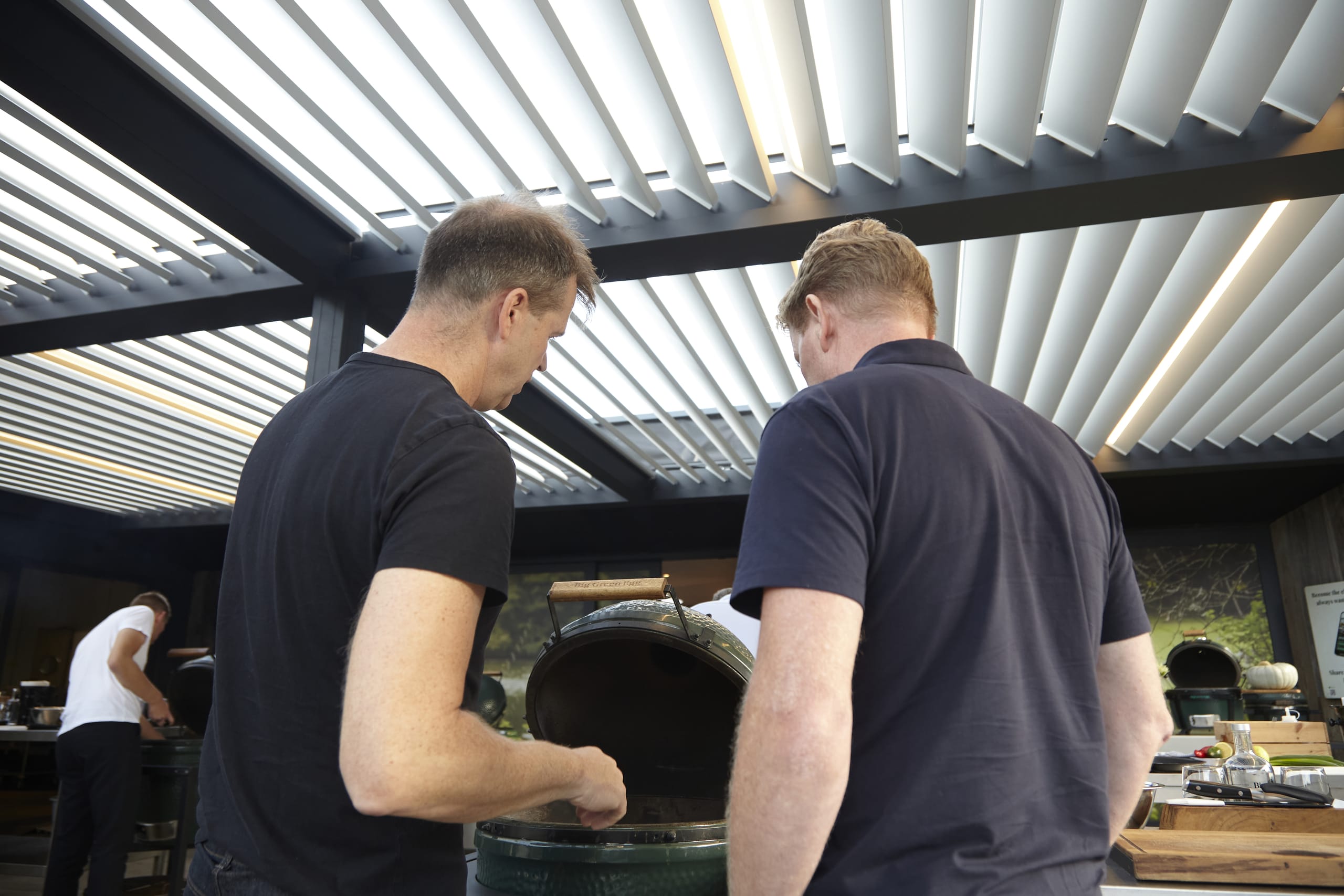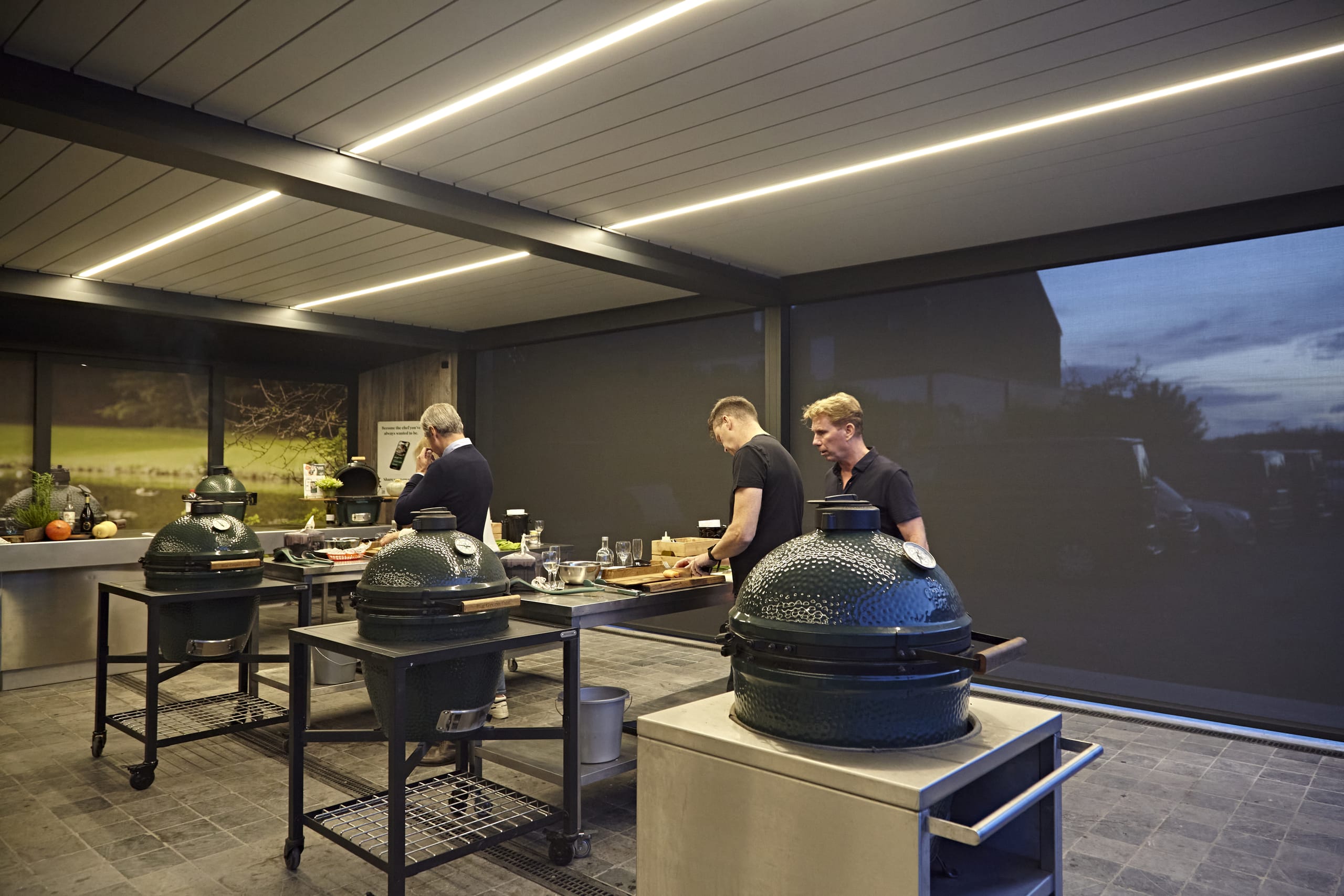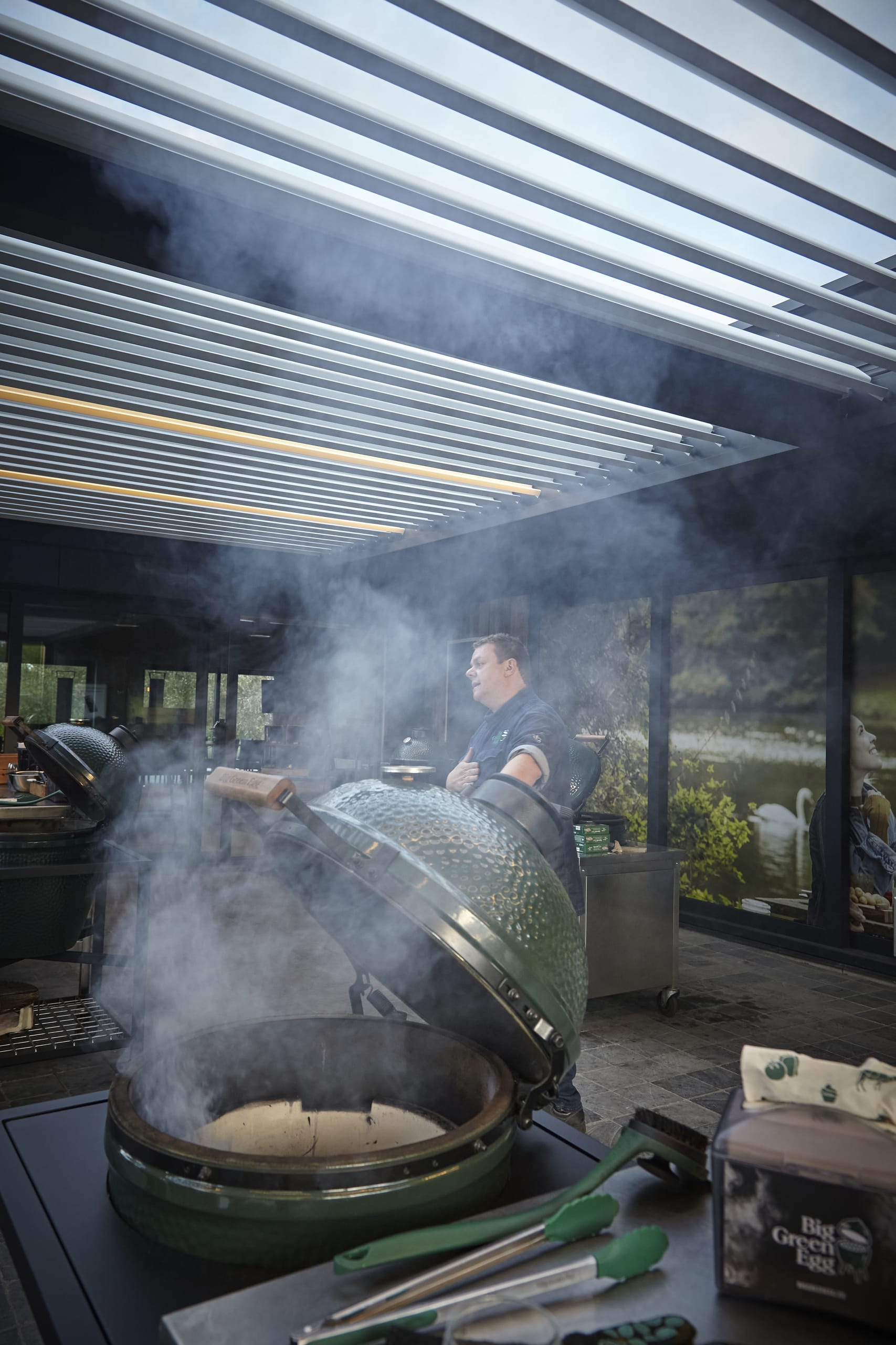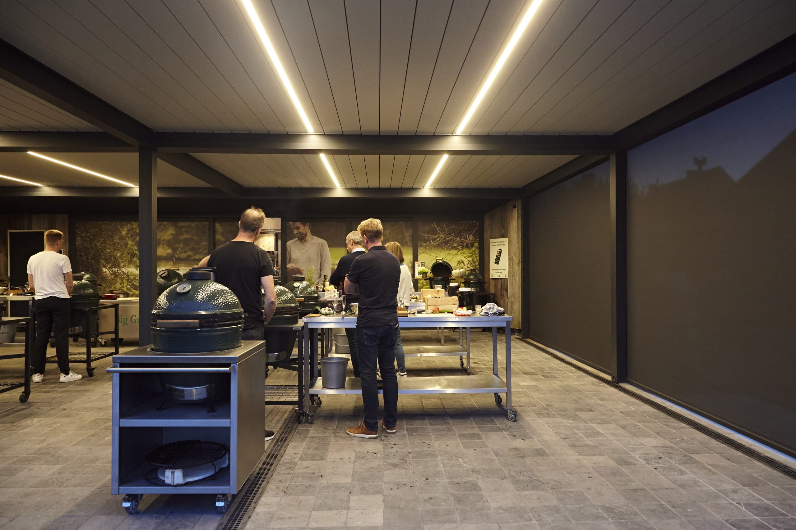 © RensonVor 15 Jahren zog Kris Vandorpe als Belux-Vertriebshändler für Big Green Egg Kamado-Grills an seinen neuen Standort in Merelbeke. Seit er seinen Showroom mit vier gekoppelten Camargue-Terrassenüberdachungen von Renson bereichert hat, kann er dort mehr Kochworkshops denn je abhalten – egal bei welchem Wetter.