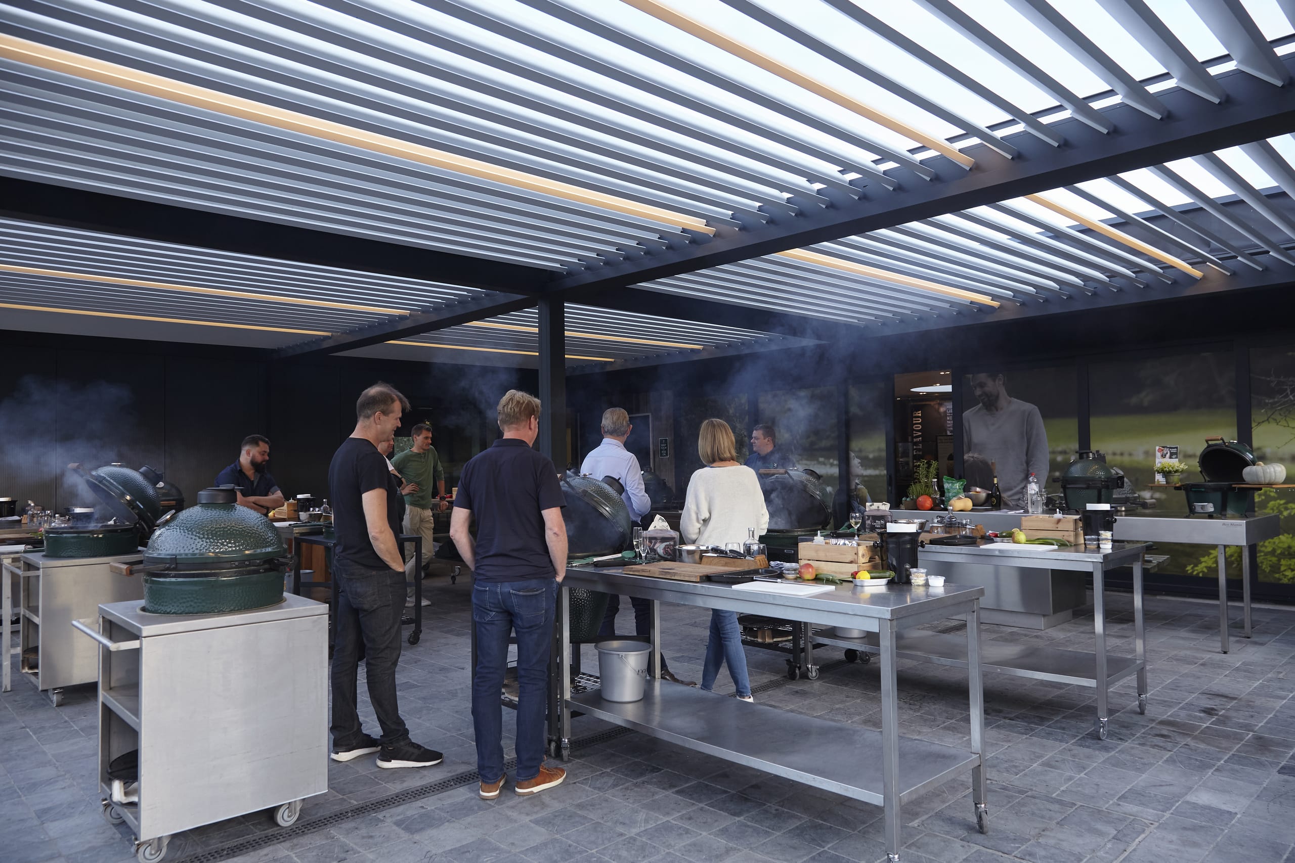 © RensonBesonders schätzt Vandorpe an den Lamellendächern, dass Hitze und Rauch von den Grillgeräten während der Workshops perfekt abziehen können. Das war ihm ein großer Dorn im Auge, als er noch auf Zelte angewiesen war. "Wir empfangen die Kunden hier auf der Südseite des Gebäudes, und deshalb ist das so wichtig", sagt er. "Aber genauso gut kann man jetzt im Winter draußen bleiben, indem man die Dachlamellen teilweise schließt, um möglichst viel Wärme drinnen zu halten. Kurz gesagt, haben wir uns bewusst für Lamellendächer entschieden, weil sich damit die Temperatur perfekt steuern lässt. Ganz zu schweigen von einem plötzlichen Regenschauer – auch der stört jetzt nicht mehr. Und an sonnigen Tagen sorgt der Lichteinfall durch die offenen, schrägen Lamellen für ein optimales Outdoor-Erlebnis. Die Richtung der Dachlamellen haben wir ganz bewusst unter diesem Gesichtspunkt gewählt." -