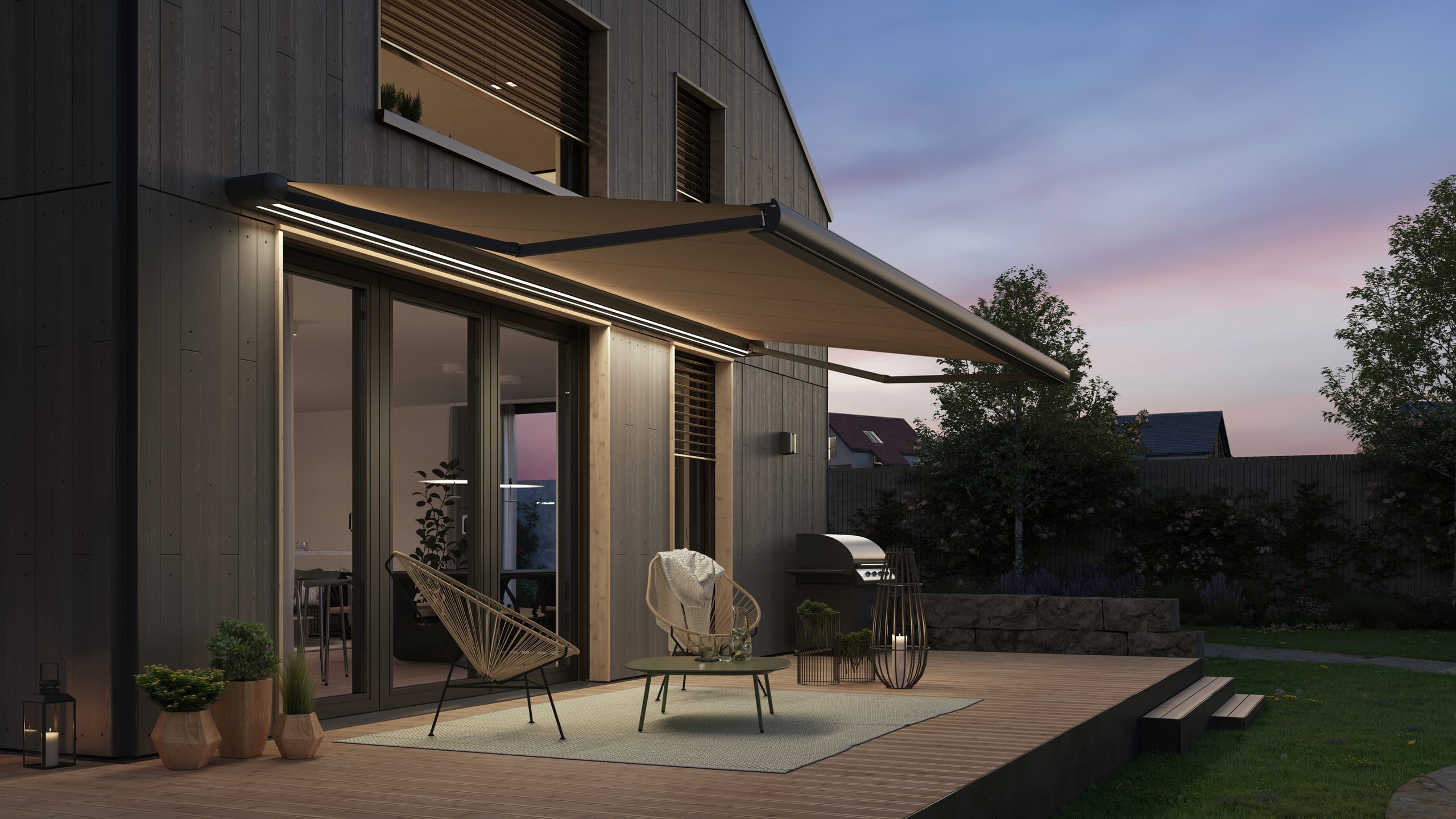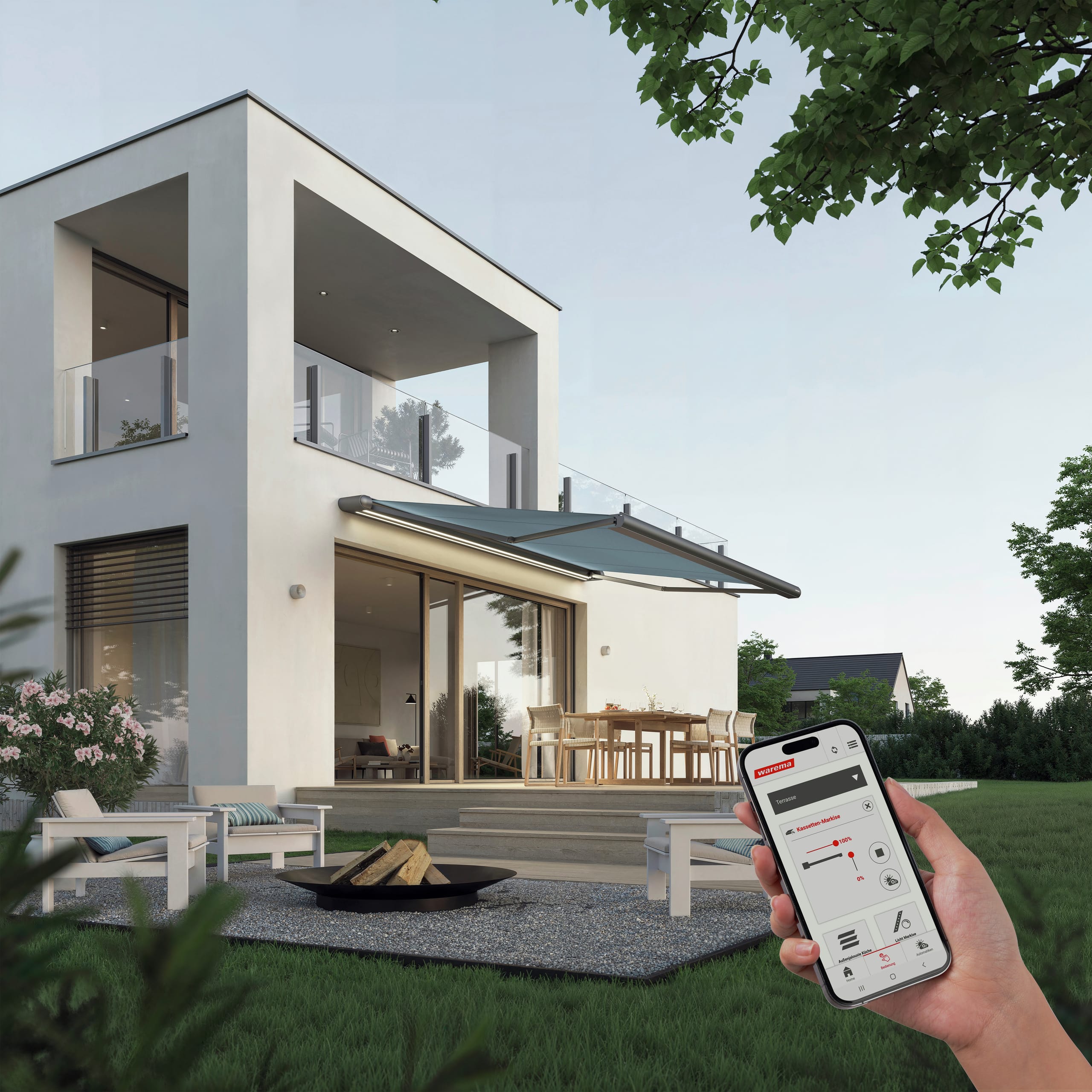 © WaremaEbenfalls zur Zusatzausstattung zählen LED-Stripes in der Kassette zur indirekten Beleuchtung im ausgefahrenen Zustand. Zudem können diese auch im Bodenprofil der Kassette integriert werden. So lassen sich Terrasse oder Balkon auch bei eingefahrener Markise stilvoll beleuchten. Für angenehme Temperaturen sorgt zudem ein Design Heizstrahler. -