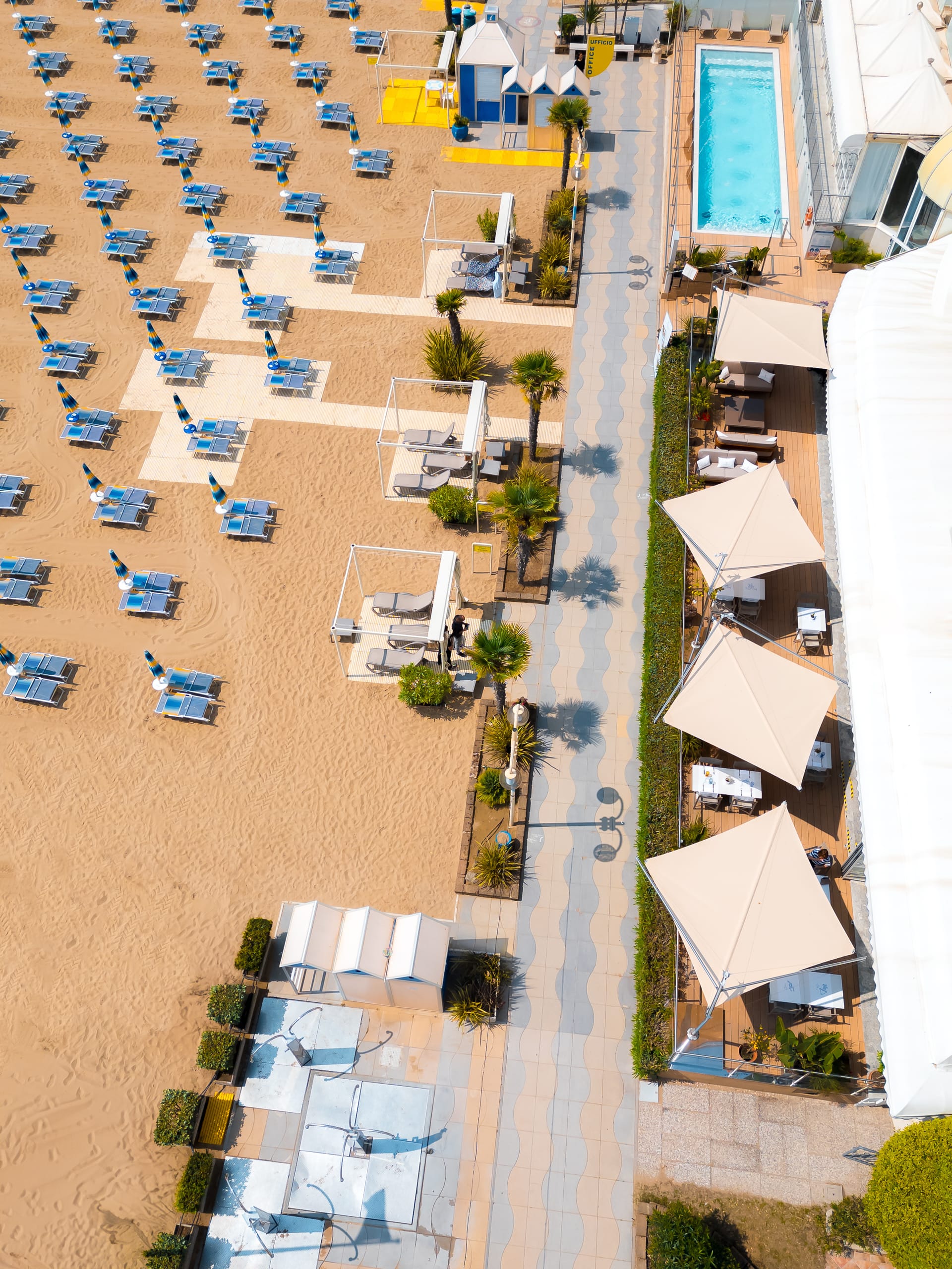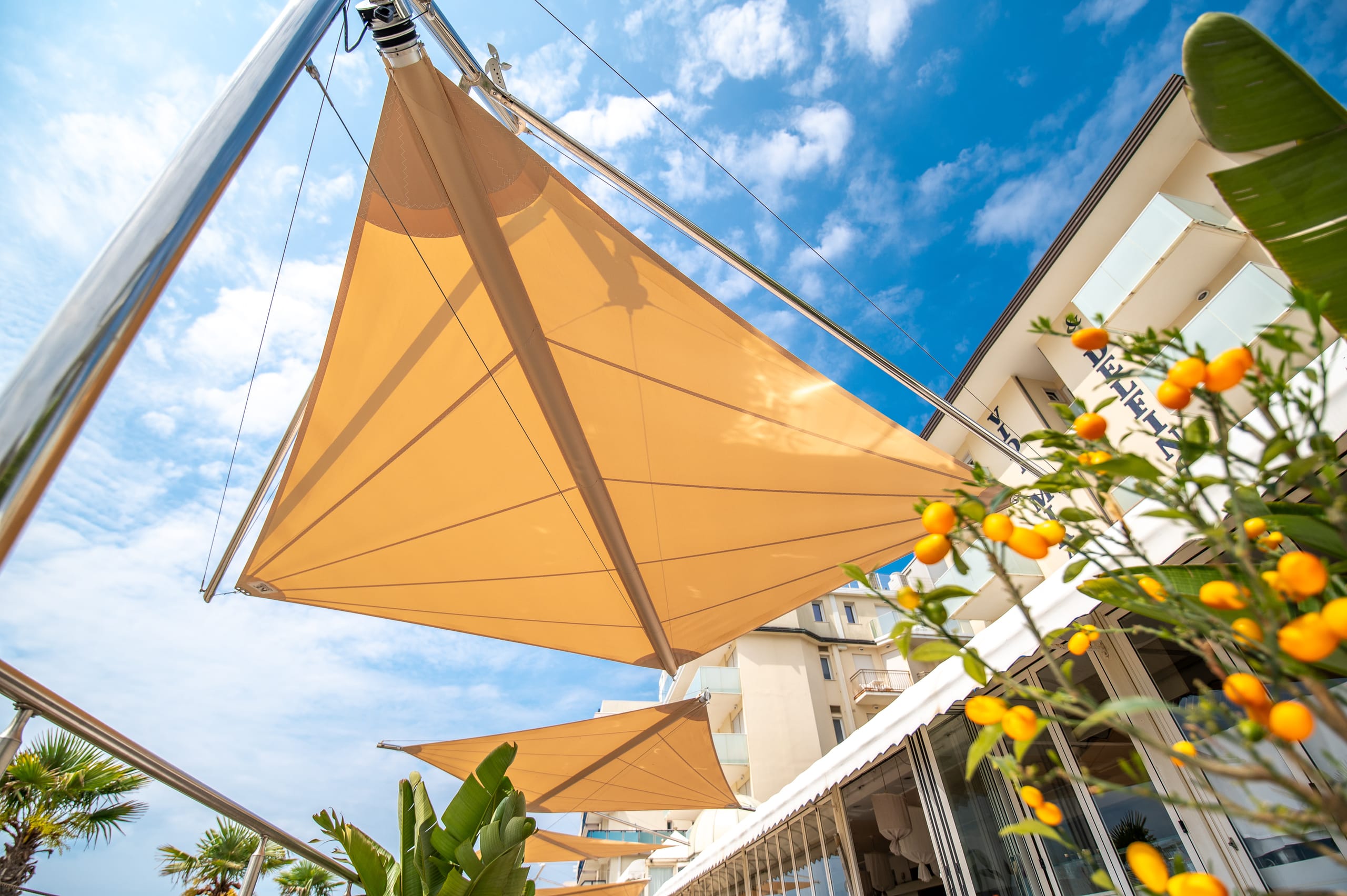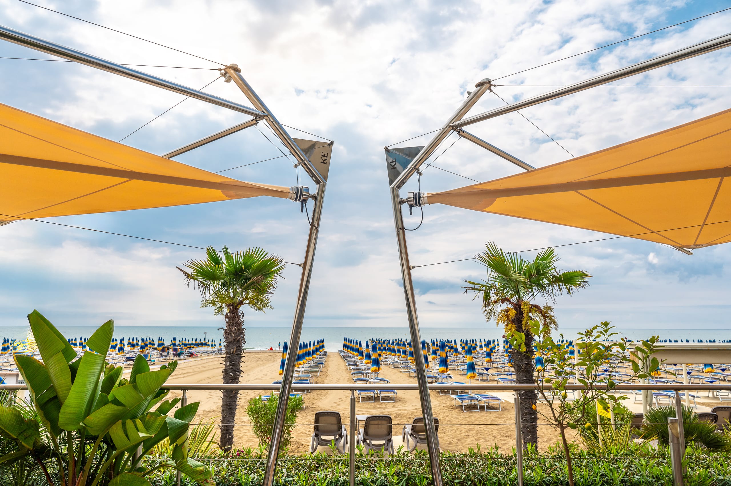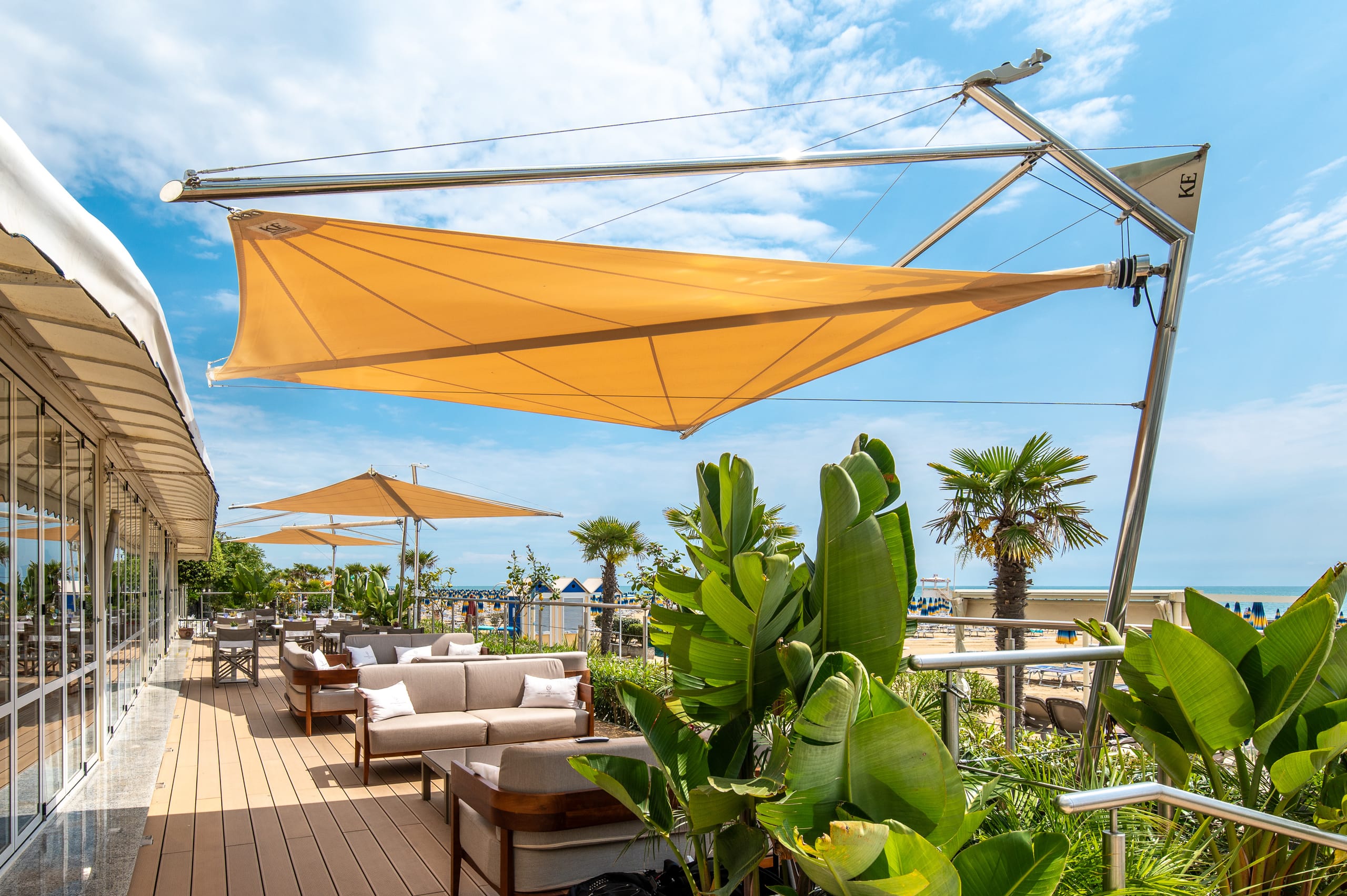 © KEBeim Projekt für das Hotel Vidi Miramare & Delfino wurde die Farbe Elfenbein für die vier installierten Segel gewählt, unter Berücksichtigung des Kontextes und des Stils des Gebäudes sowie der Notwendigkeit, sich mit minimaler Beeinträchtigung in die Umgebung des Strandes einzufügen. -