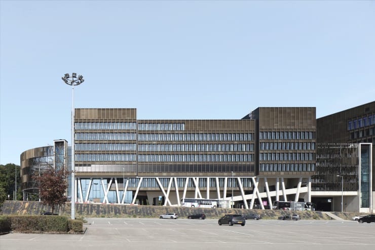 © Warema/Architekten SteinmetzdemeyerIn einem der Bürogebäude über dem Busbahnhof sorgen Raffstoren von Warema für einen leistungsstarken Sonnen- und Blendschutz. Optisch prägend sind die schräggestellten Betonstützen der Tragkonstruktion. -