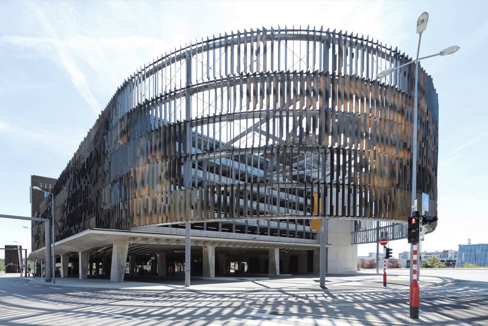 © Warema/Architekten SteinmetzdemeyerDas Parkhaus erhielt eine einzigartige Fassade aus Großlamellen von Wings Professional, die nach einem Architektenentwurf individuell gefertigt wurden.