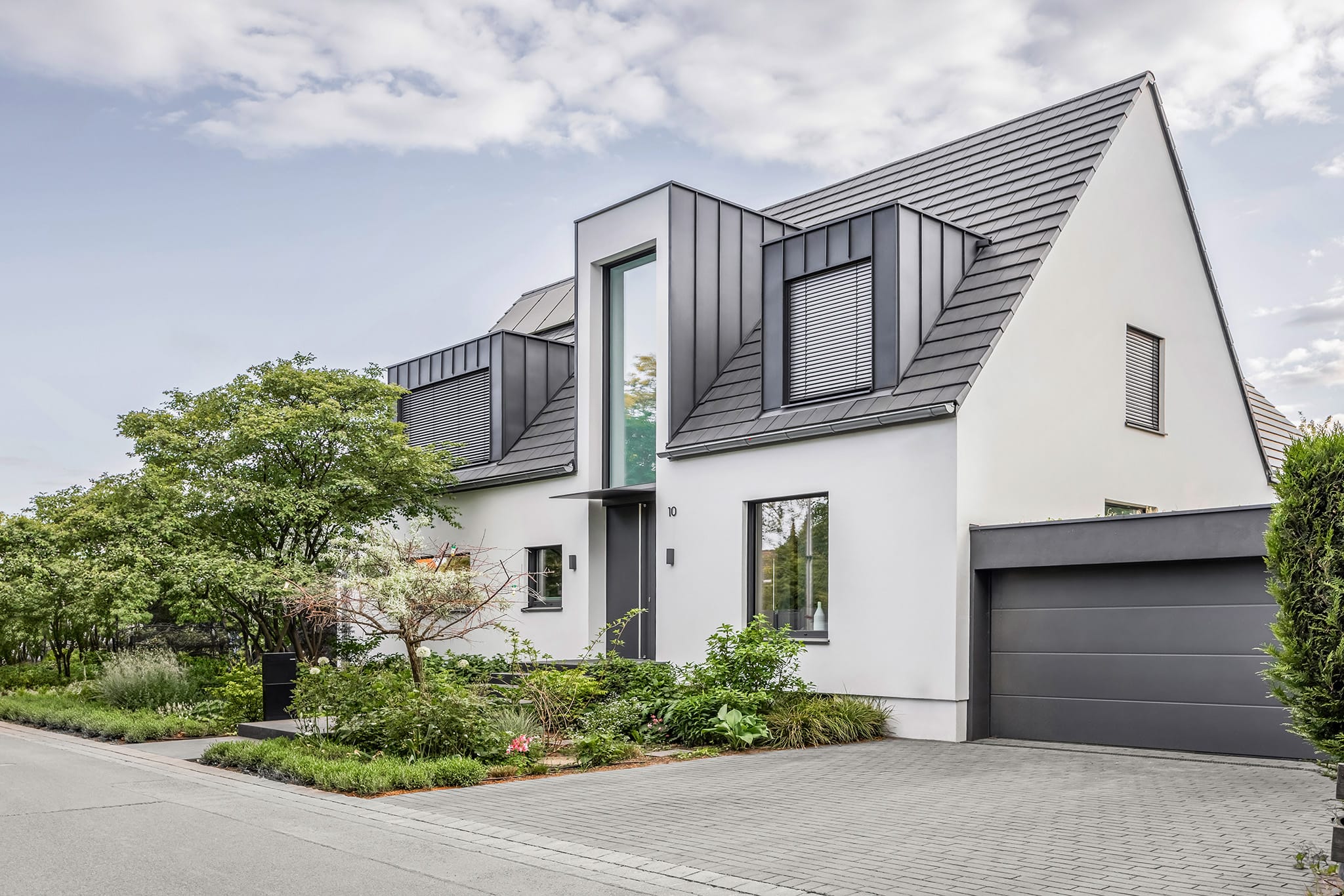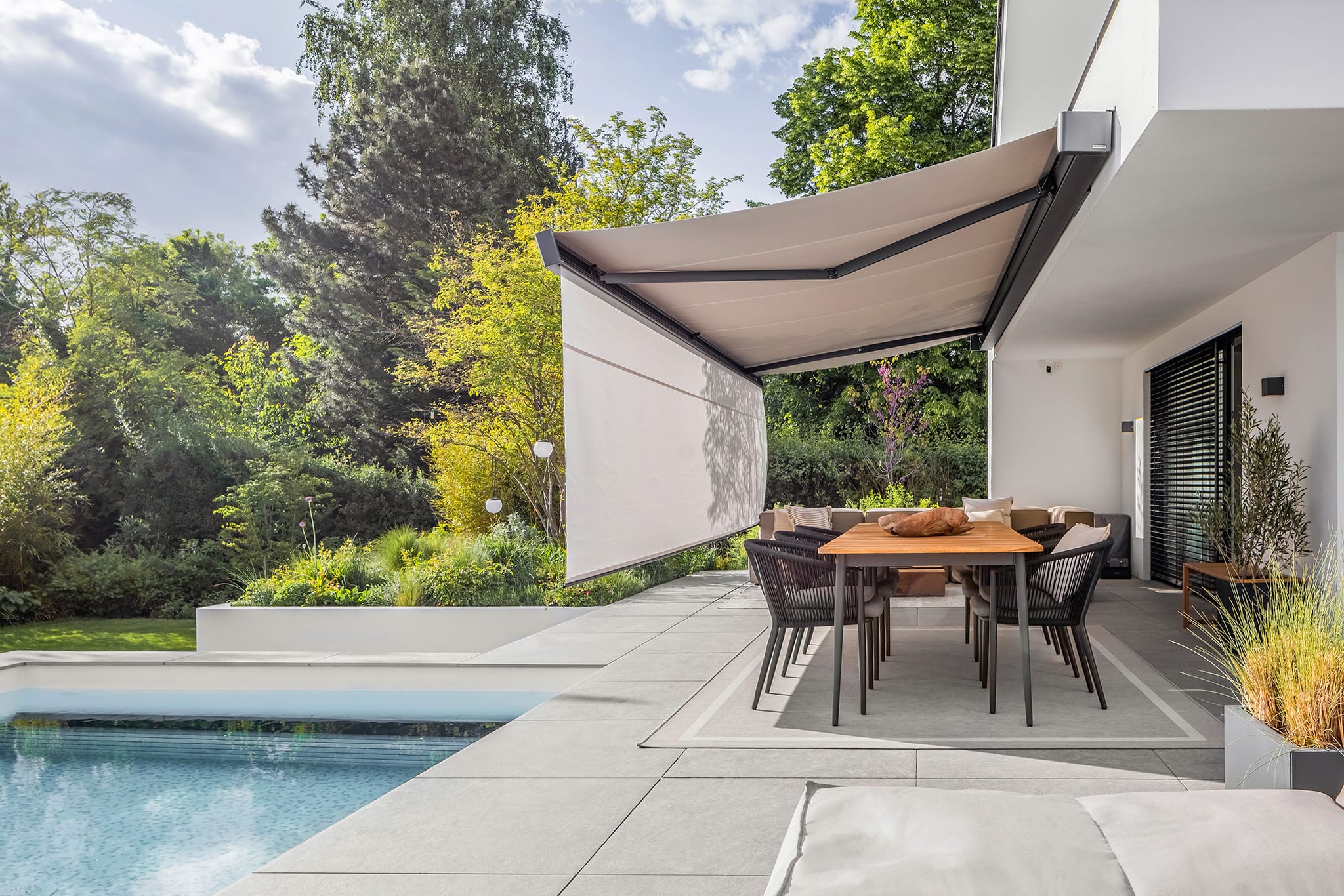 © WaremaDas sanierte Einfamilienhaus überzeugt mit klaren Linien, einer lichtdurchfluteten Wohnfläche von 320 Quadratmetern sowie einer Südterrasse mit Pool. Ein neues Steildach mit Gauben sorgt für besser nutzbaren Dachraum. Die hohe Dachgaube, welche auch mit Raffstores beschattet ist, akzentuiert den Eingangsbereich und sorgt so jederzeit für die richtige Dosis Tageslicht. -