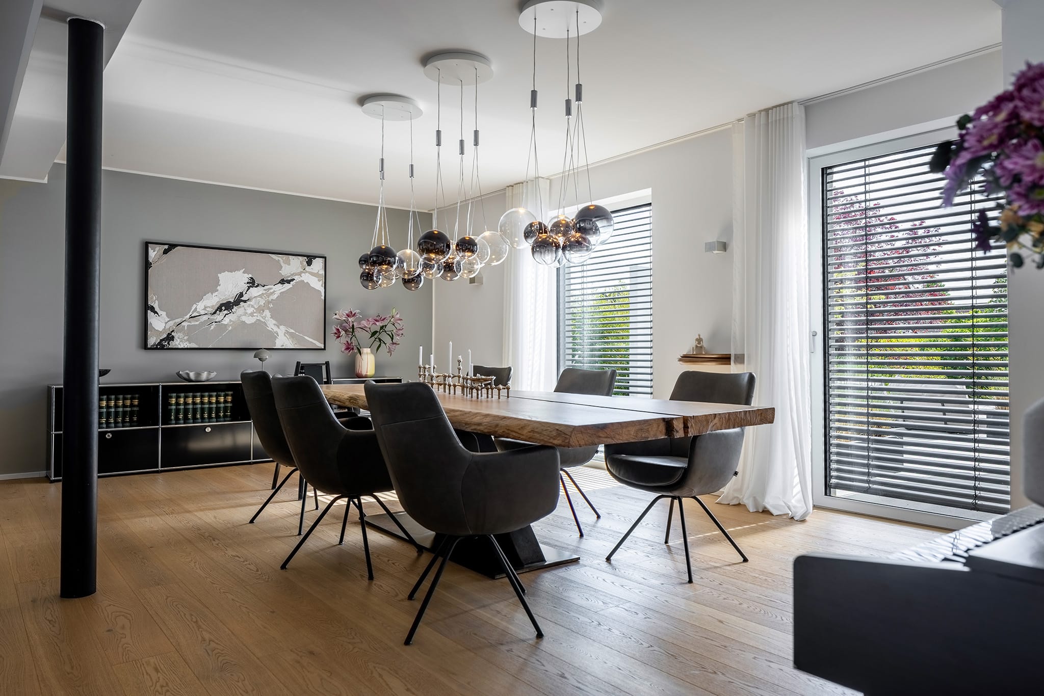 © WaremaDurch das Entfernen von Zwischenwänden entstand ein großer Essbereich. Die Raffstores schützen nicht nur vor Sonne und Hitze – sie lassen Tageslicht in den Raum, ermöglichen den Blick nach draußen oder bieten Privatsphäre. Neben Langlebigkeit und Ästhetik überzeugten die Bauherren auch die hohe Qualität der Warema Produkte. "Die Lamellen klappern nicht – auch wenn es draußen windig ist, hört man von innen nichts". -