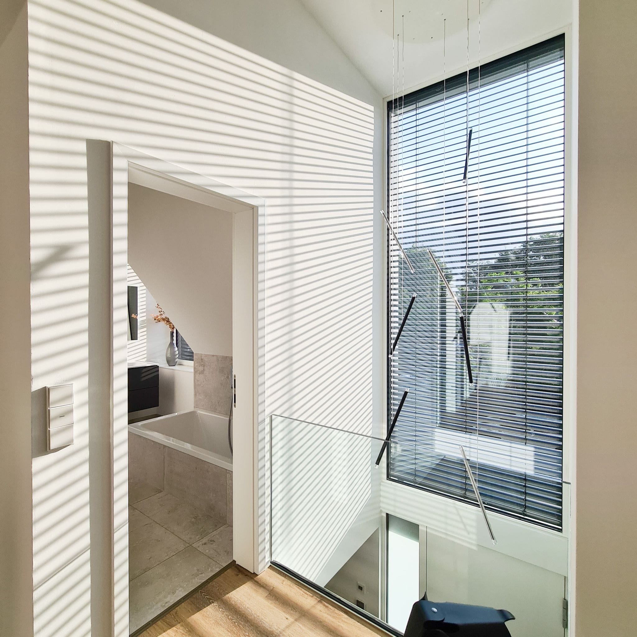 © WaremaDurch den Einbau in der Dämmebene sind die Raffstores in hochgefahrenem Zustand unsichtbar und unterstreichen das Gesamtbild des Hauses. Neben der hochwertigen Qualität zählte für die Architekten besonders, dass die Lamellen farblich passend zu den Fensterprofilen verfügbar waren. Heruntergefahren und mithilfe der flexibel steuerbaren Lamellenstellung bieten die Raffstoren im Innenraum "ein superschönes Spiel mit Licht und Schatten", so die Hausherrin. -