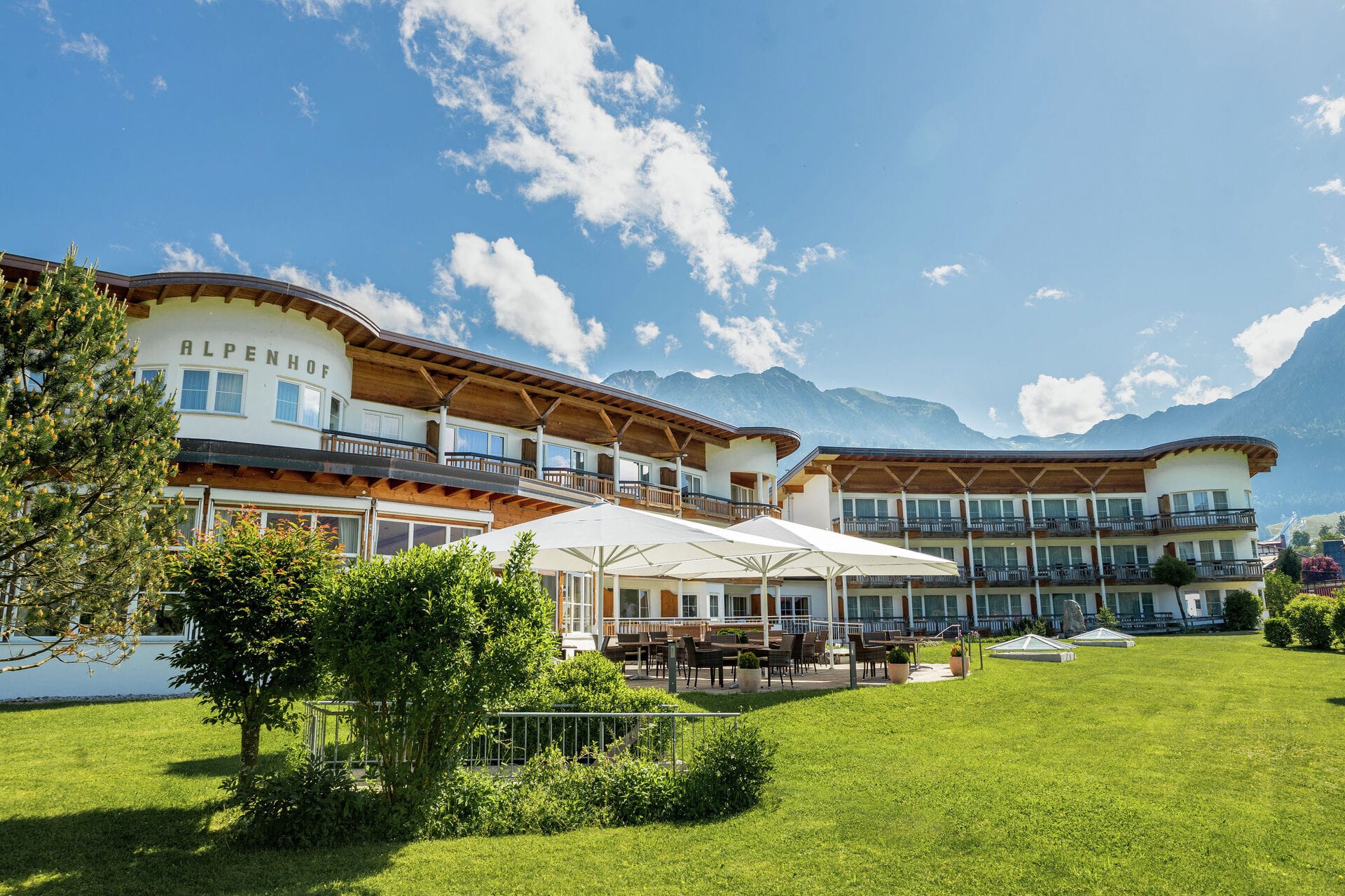 © Caravita/Hotel Alpenhof/Tim GlöcklerDie drei Großschirme bilden optisch mit der Architektur des Hotels Alpenhof eine harmonische Einheit und laden zum Verweilen ein. Die Sonderformen der windstabilen Schattenspender ermöglichen es, den vorhandenen Platz effizient zu nutzen. Der Allrounder ist in vielfältigen Formen – rechteckig, quadratisch, dreieckig oder rund – sowie in über 50 Größen erhältlich. -