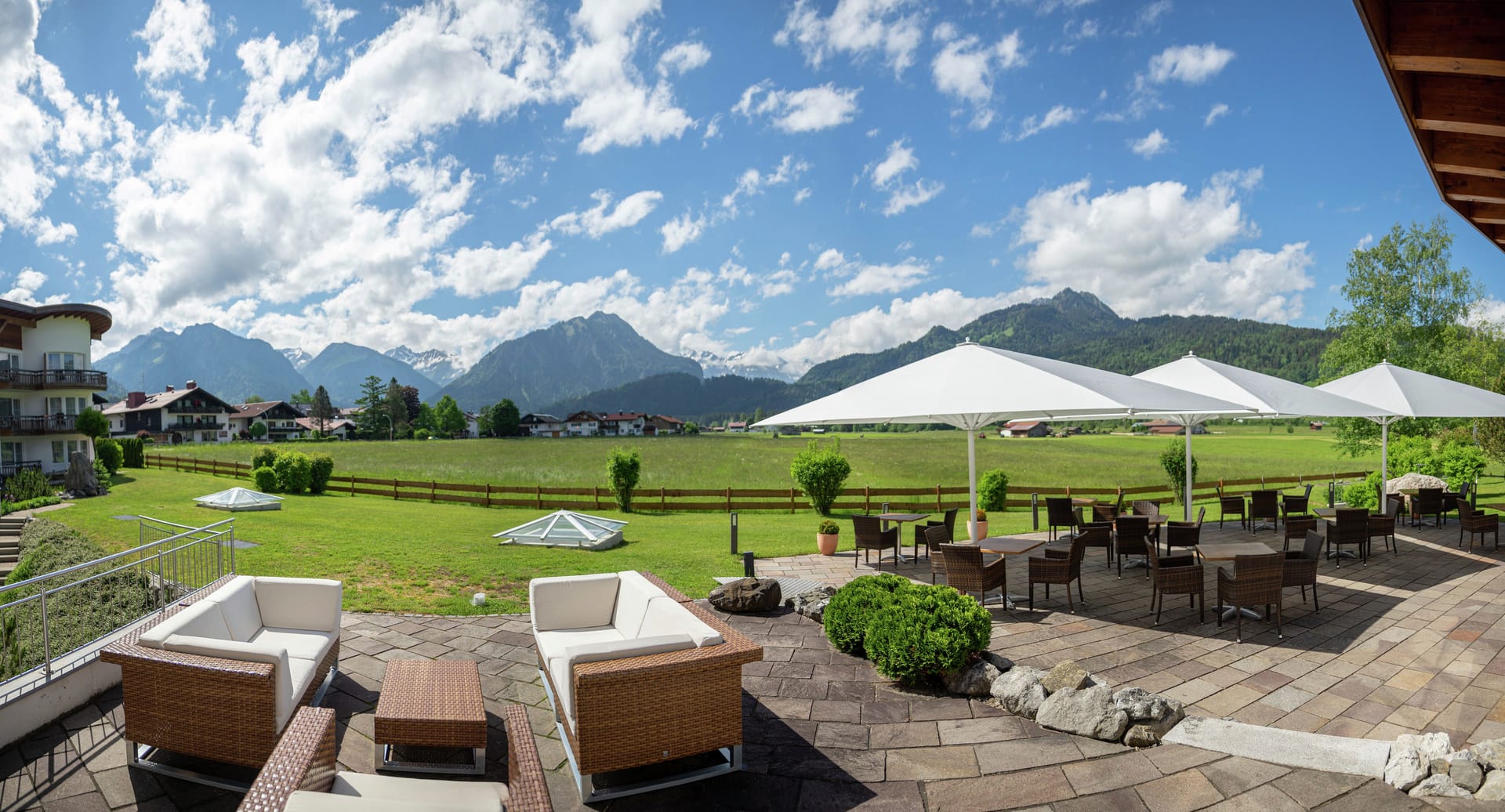 © Caravita/Hotel Alpenhof/Tim GlöcklerProfessionelle Schirme, die den Gästen in der Außengastronomie möglichst flächendeckenden Schutz vor Sonne und Regen bieten, erhöhen die Aufenthaltsqualität – und stärken die Zeiten der Outdoor-Bewirtung. Das Best Western Plus Hotel Alpenhof in Oberstdorf hat bei der Verschattung der Terrasse des Restaurants Alpblick darauf geachtet, zwischen den beschirmten Flächen keine großen Lücken entstehen zu lassen. So fiel die Wahl auf eine Variante des Gastroschirms Big Ben von Caravita: den Freestyle. -