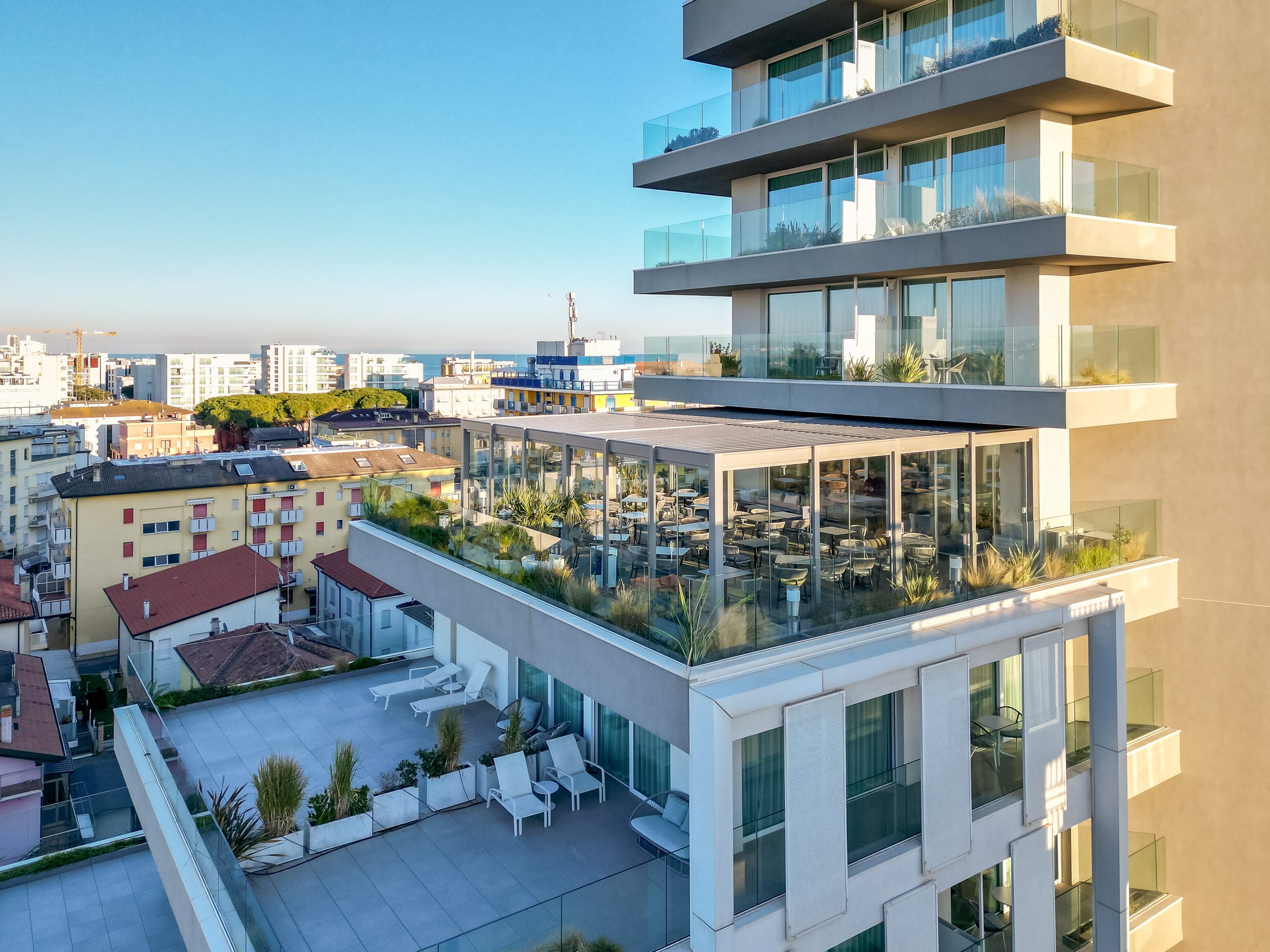 © KEDas J44 Lifestyle Hotel im italienischen Jesolo bietet seinen Gästen ein modernes und raffiniertes Empfangserlebnis. Auf der sechsten Etage des Fünf-Sterne-Hotels befindet sich eine große Terrasse mit Außenpool und Skybar, wo die Gäste ihren Cocktail sowie den Blick auf die Skyline von Jesolo bis hin zur Lagune von Venedig genießen können. -