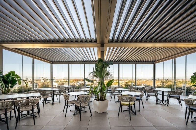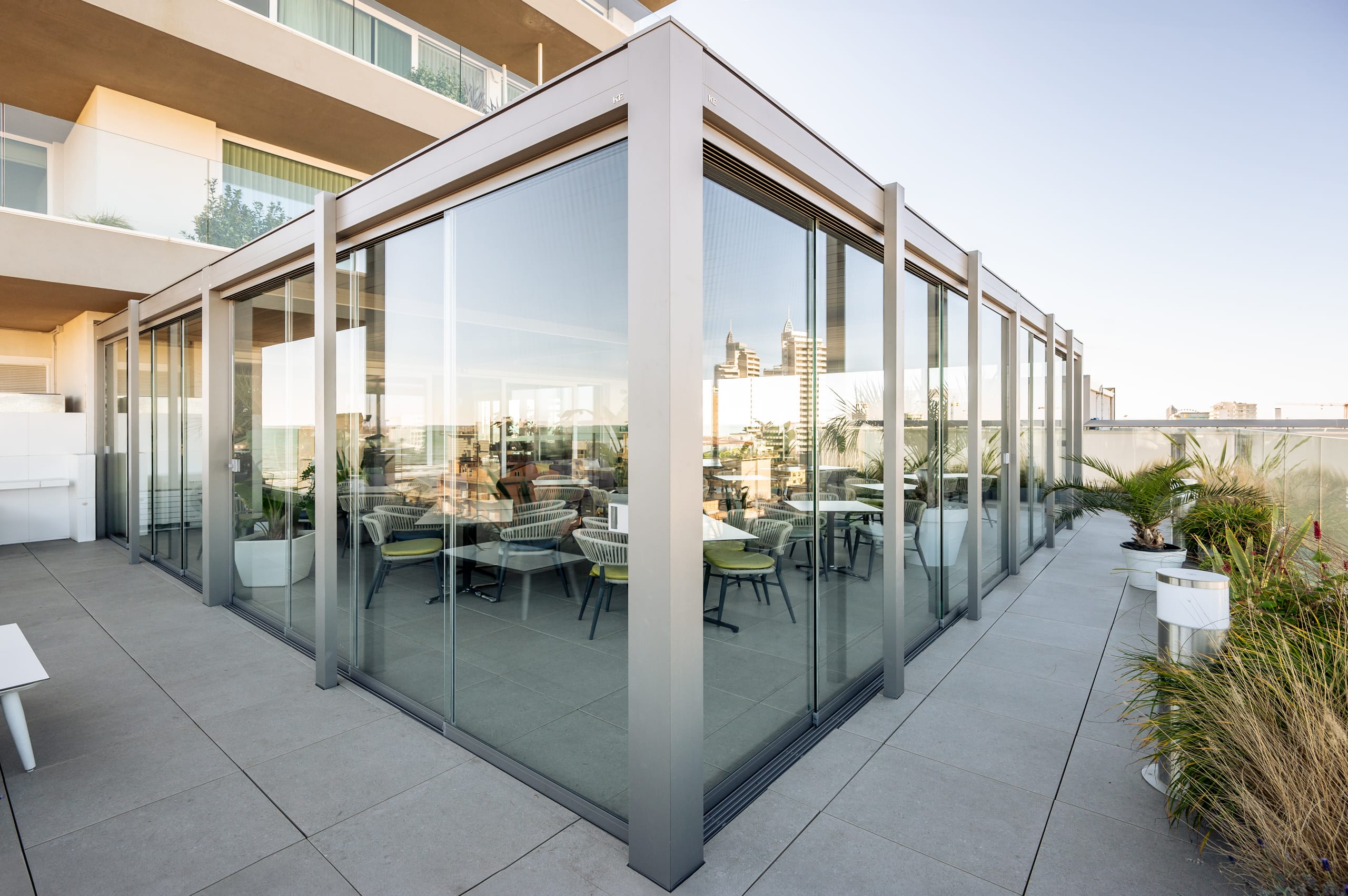 © KEBei dem Entwurf für das J44 wurde die Farbe der Struktur, ein mattes Aluminium, so gewählt, dass sie perfekt mit der minimalistischen Architektur des Hotels harmoniert. Darüber hinaus lässt sich die Pergola an den Seiten mit Line Glass-Fenstern schließen, sodass der Ort bei jedem Wetter perfekt nutzbar ist. -