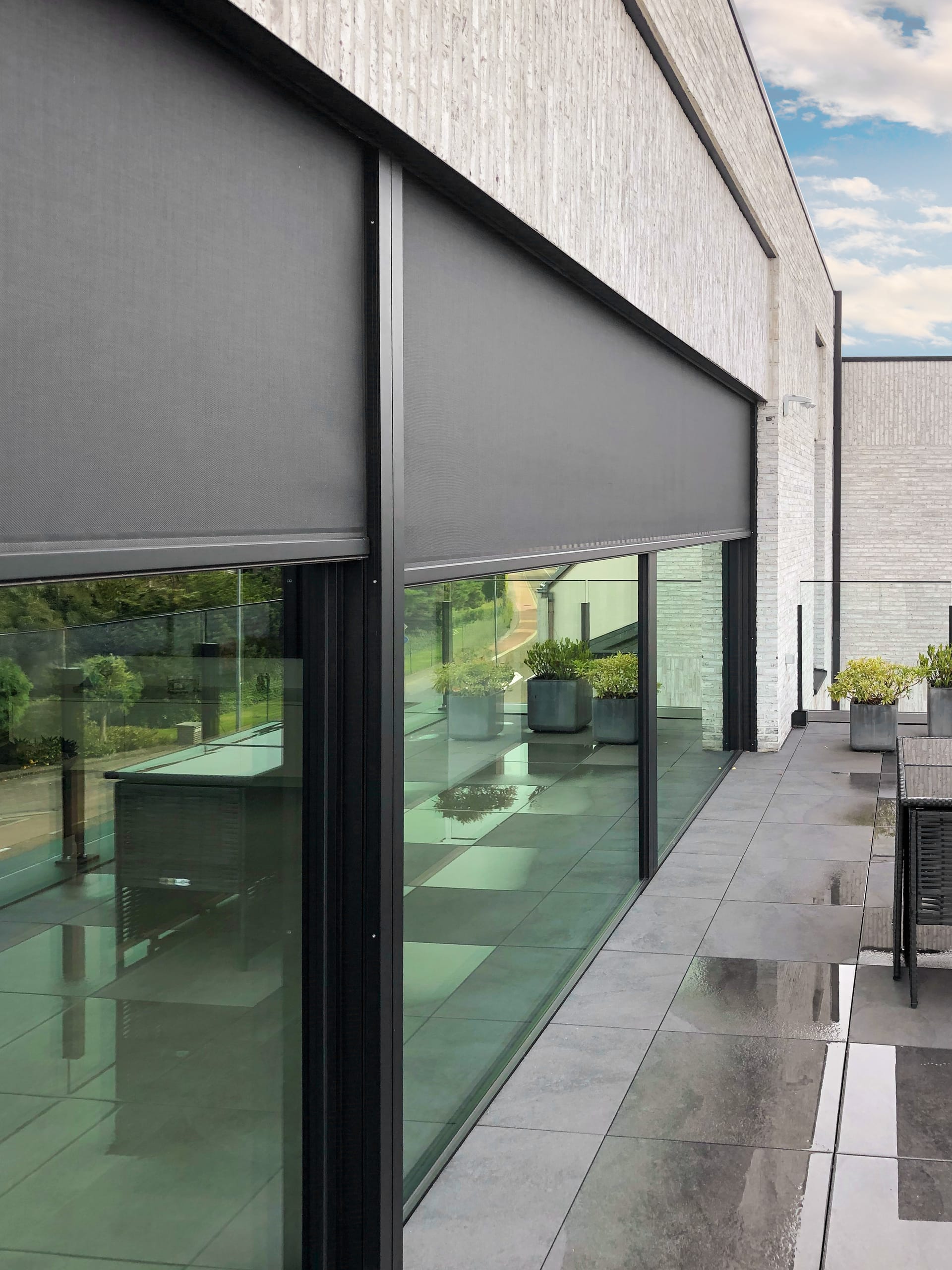 Die Wärme bleibt im Sommer draußen, dank der Screens ist keine stromfressende Klimaanlage notwendig. Das schwarze Sonnenschutzgewebe ist lichtdurchlässig und teiltransparent, aber trotzdem hitzeabweisend. Auch deren Montageart kann aus optischen Gründen punkten: Die Aufsatzkästen auf den Fenstern wurden in die Fassade integriert, sind also von außen nicht sichtbar.