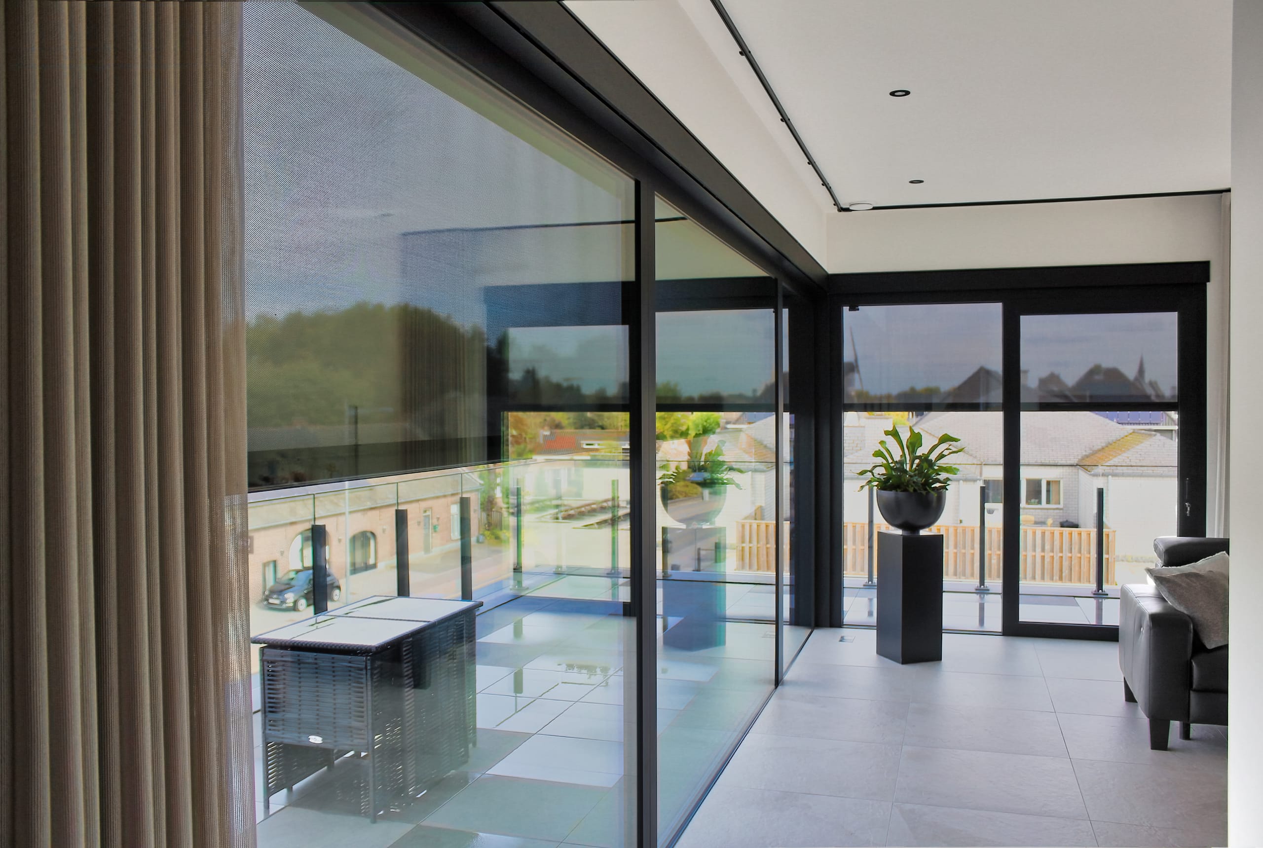 Die schwarzen Aluminiumfenster stammen von Profel. Der große Fensterhersteller aus Belgien ist – genauso wie der Sonnenschutzproduzent Wilms – seit vielen Jahren Fachkunde von Selve. Von Wilms aus dem belgischen Meerhout wurden die passgenauen Zip-Screens projektiert und maßgefertigt, die nun bei den Eigentümern für optimalen Licht- und Sonnenschutz sorgen.