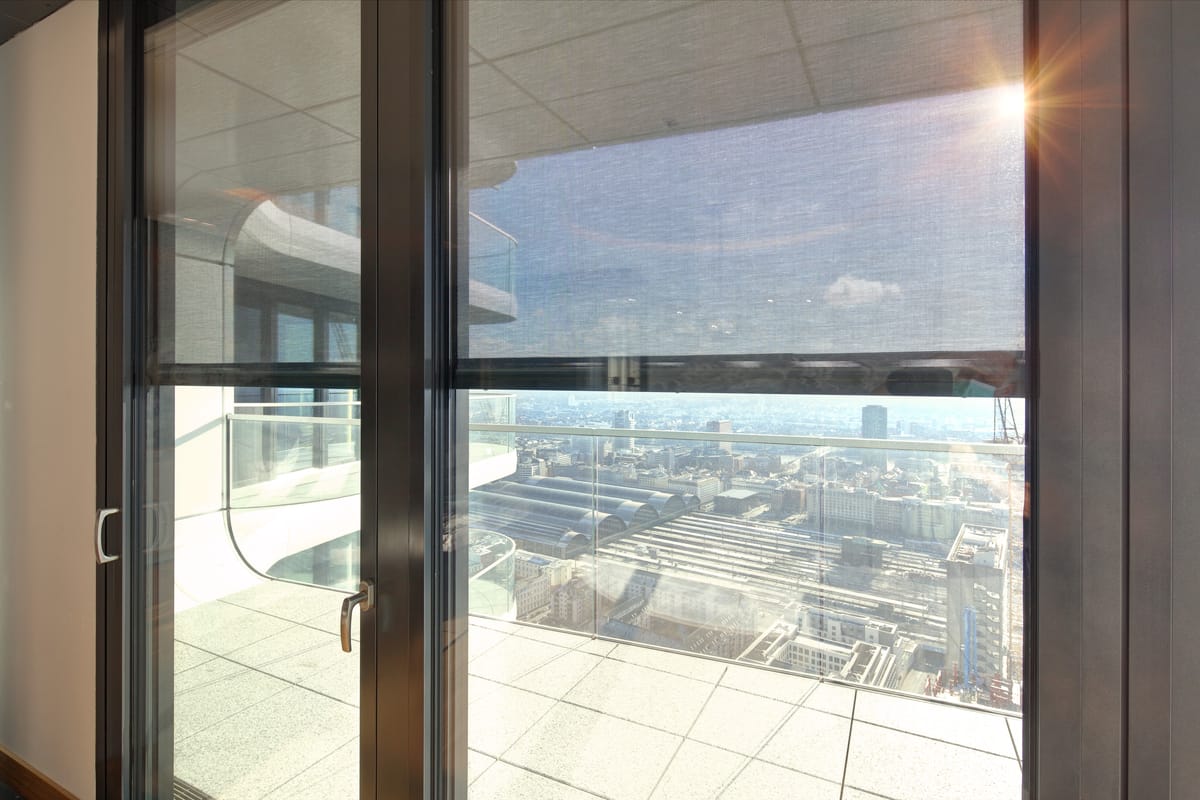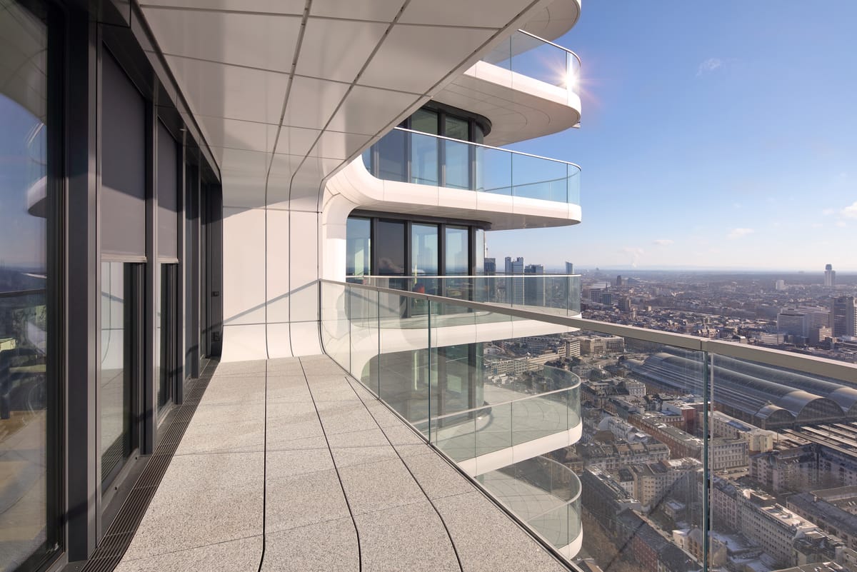 © WaremaDie Außenhülle ist mit bodentiefen Fenstern fast vollständig verglast und erlaubt spektakuläre Ausblicke über Frankfurt. -