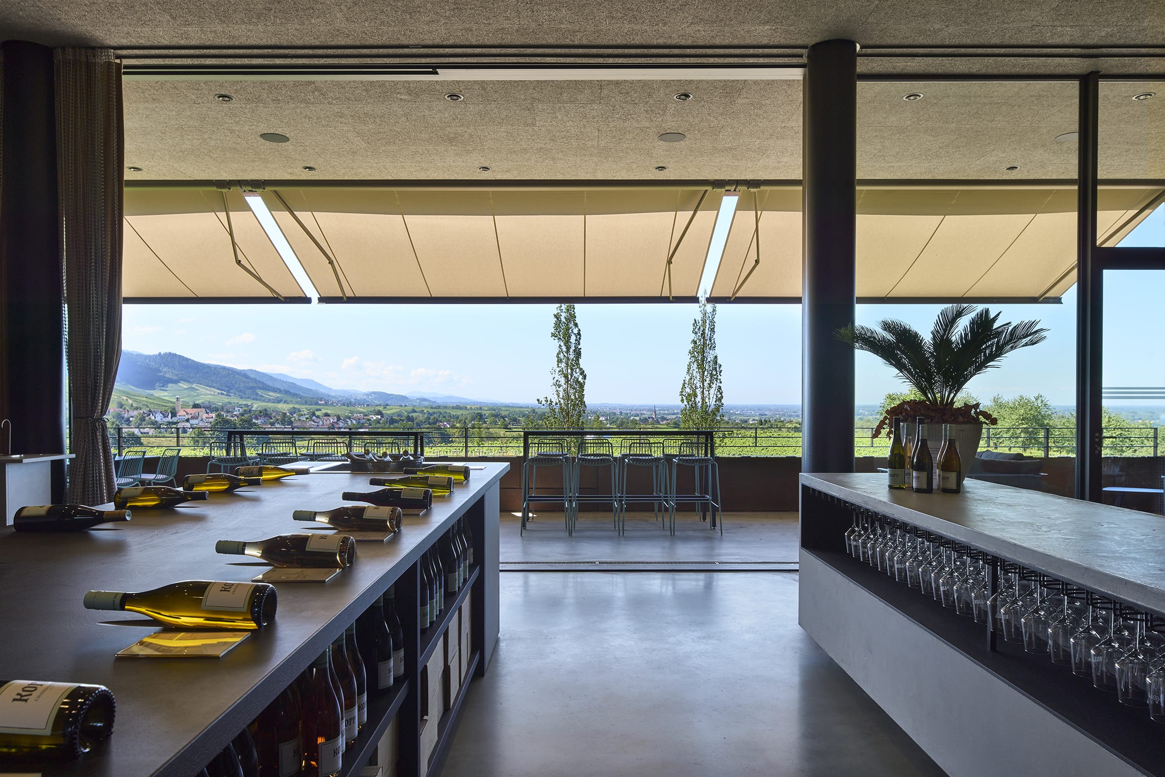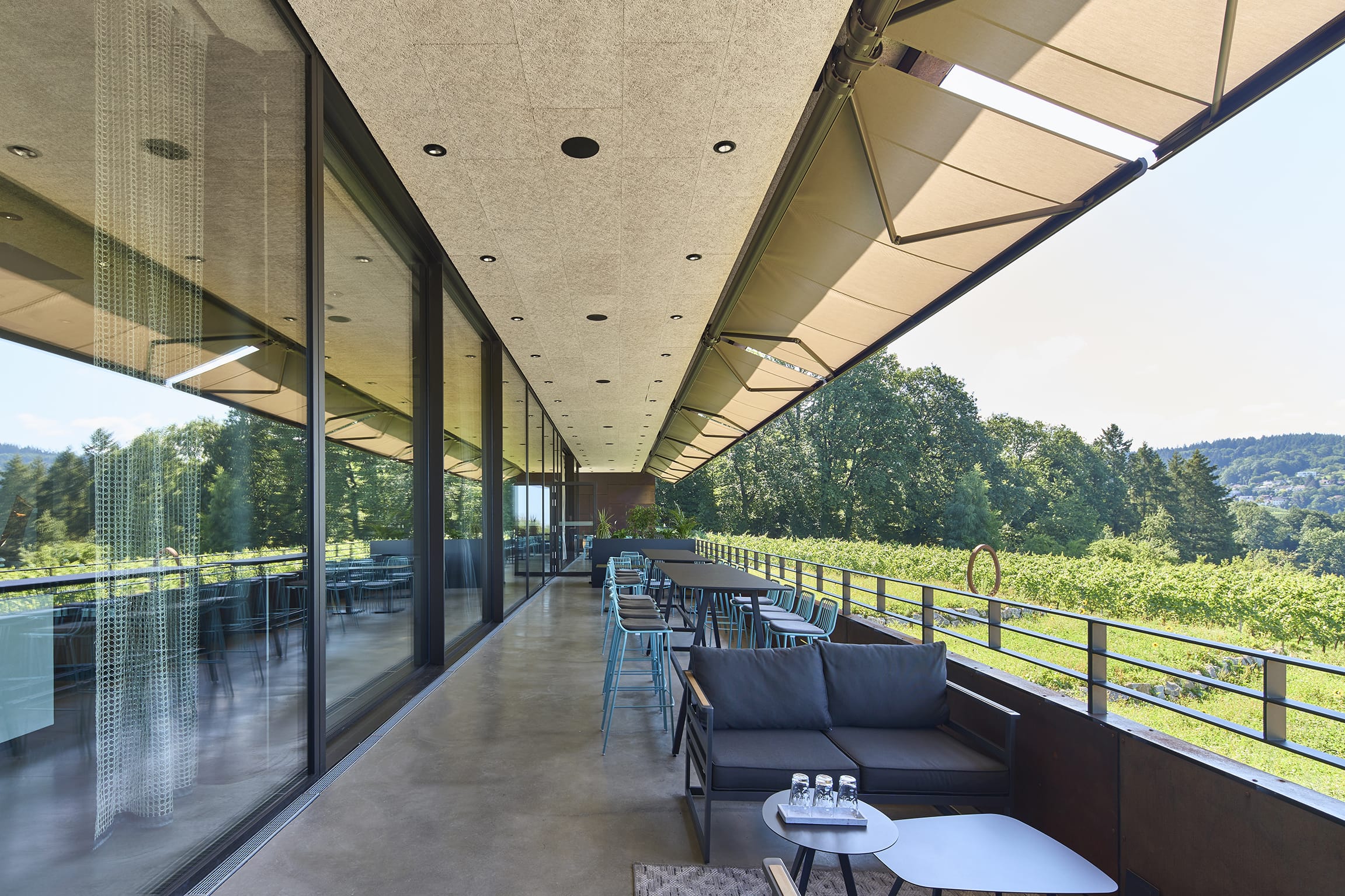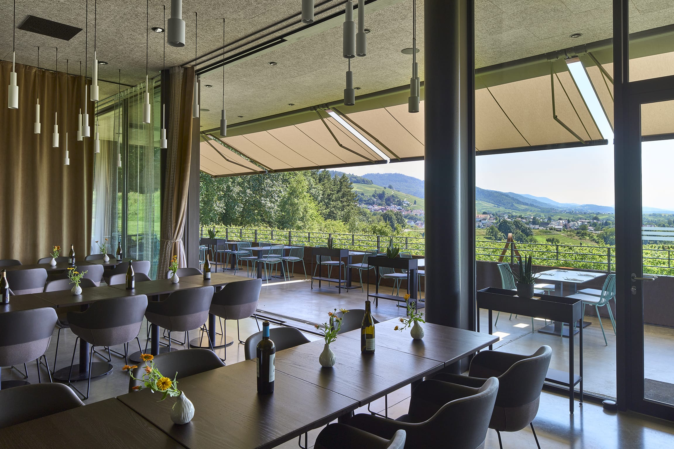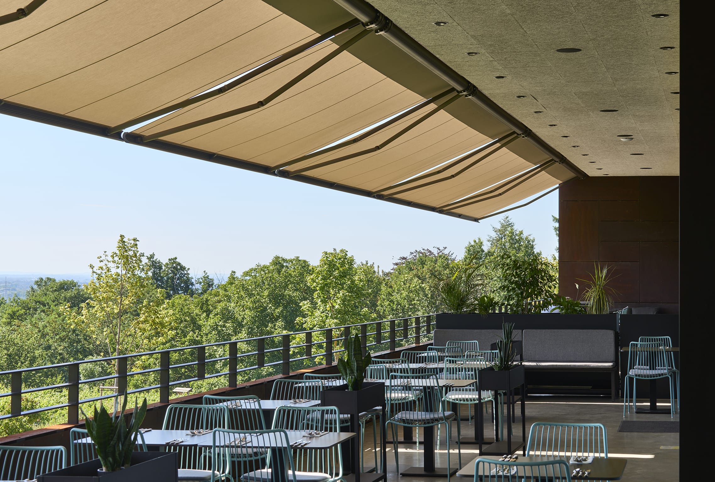 © MarkiluxDank der großzügigen Markisenanlage von Markilux können die Gäste den spektakulären Blick auf die Rheinebene gut geschützt genießen.