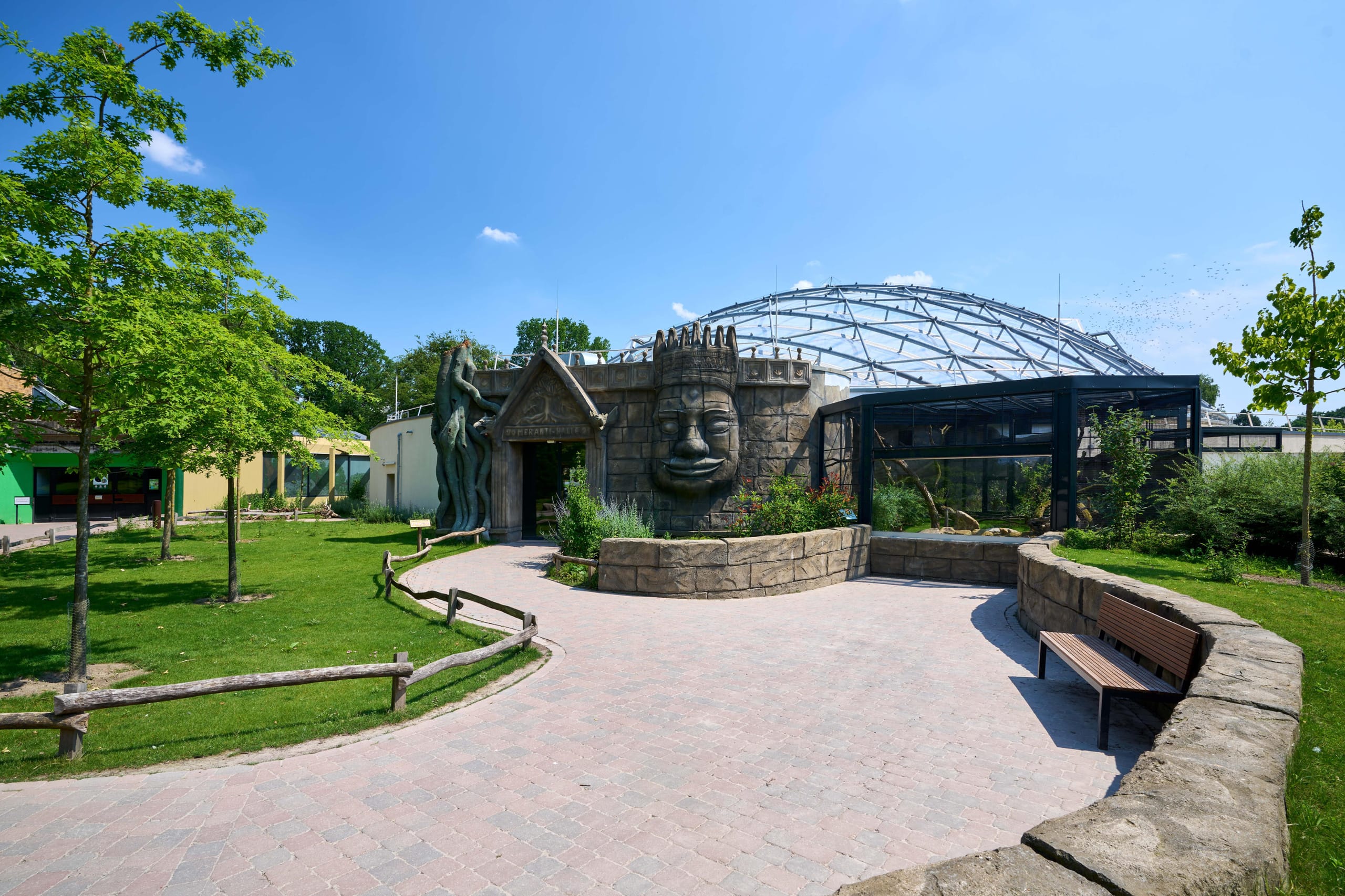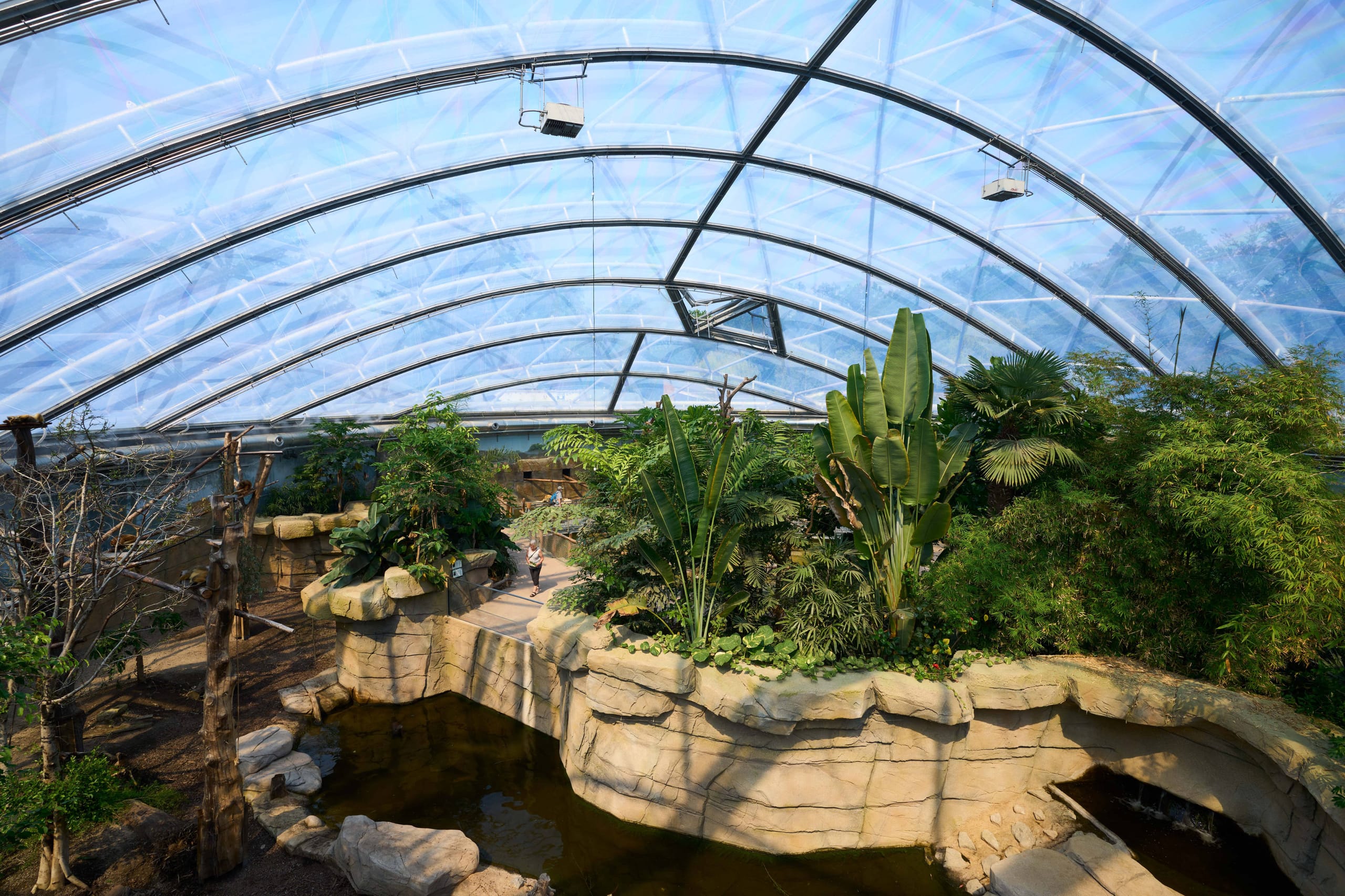 © Matthias Groppe/TeckentrupEin Dschungel-Abenteuer auf mehr als 4000 Quadratmetern erstreckt sich seit Neuestem im Allwetterzoo in Münster. Bereits von außen besticht die Meranti-Halle durch die enorme Folienkuppel, die 16 Meter in die Höhe ragt. Trotz Personalausfällen, Lieferengpässen, Energiekrise und Inflation wurde das 21,5-Millionen-Euro-Projekt mit nur wenigen Monaten Verzögerung im Juni 2023 eröffnet. Teckentrup hat die Halle mit 39 Stahltüren und einem Industrie-Sektionaltor ausgestattet. -