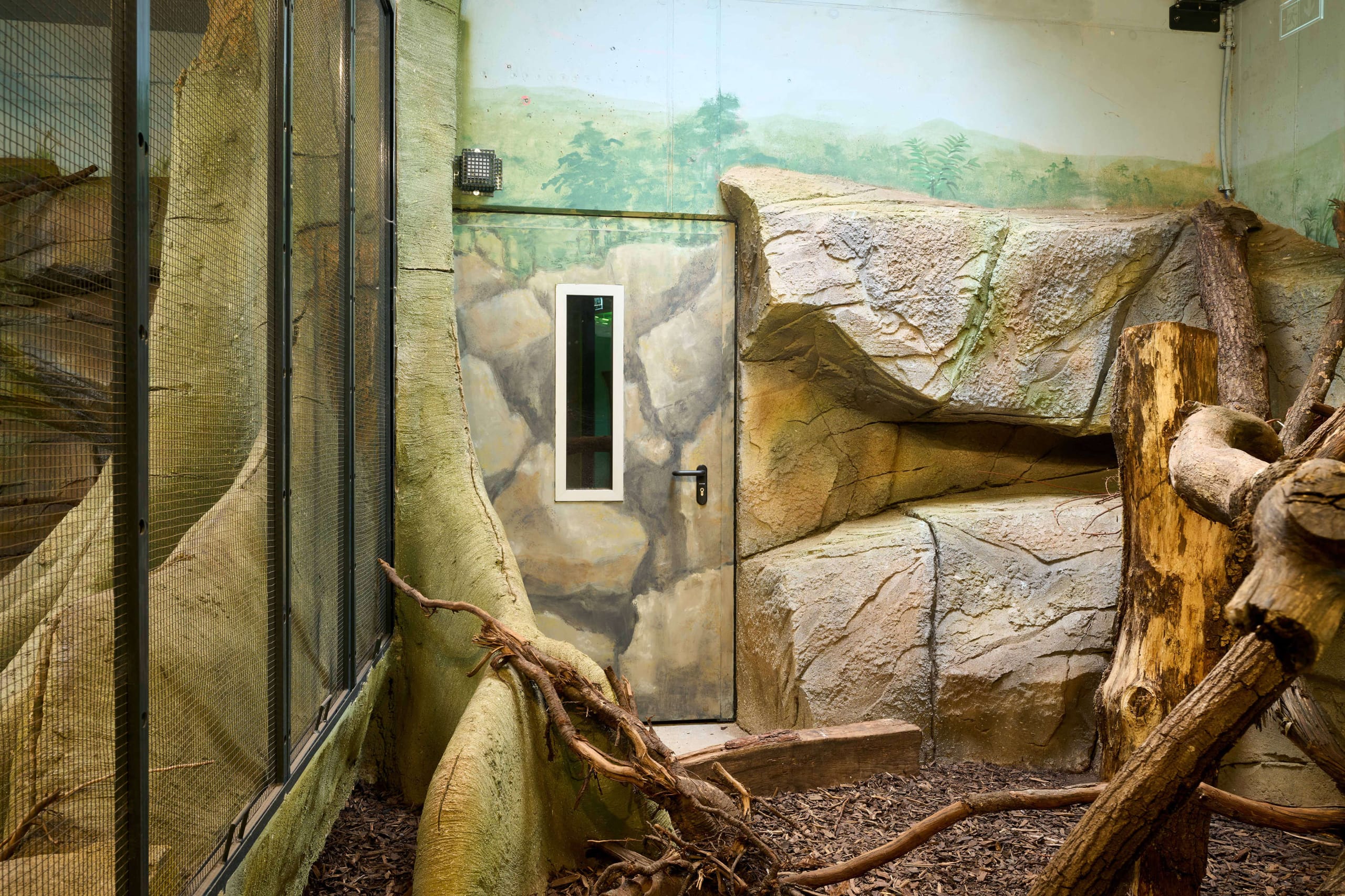 © Matthias Groppe/TeckentrupBei den Zugängen zu den Technikräumen sowie zu den Tierbereichen kommen Stahltüren in RAL 7016 in verschiedenen Ausführungen (dw 62, EI₂30-C5) zum Einsatz. In den Tierbereichen sorgen Verglasungselemente und Oberblenden für einen zusätzlichen Lichteinfall bzw. den nötigen Sichtkontakt vor Betreten eines Geheges.