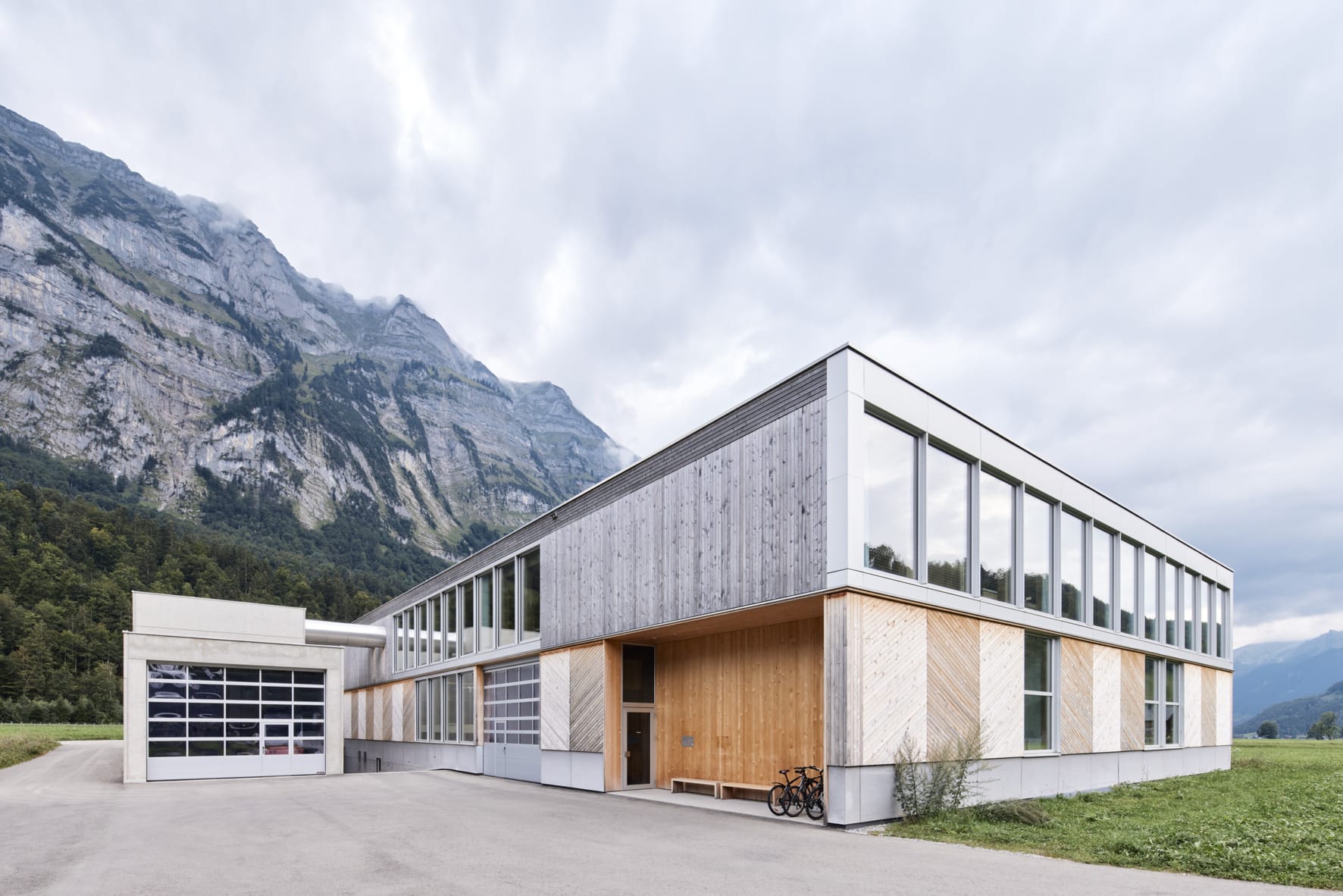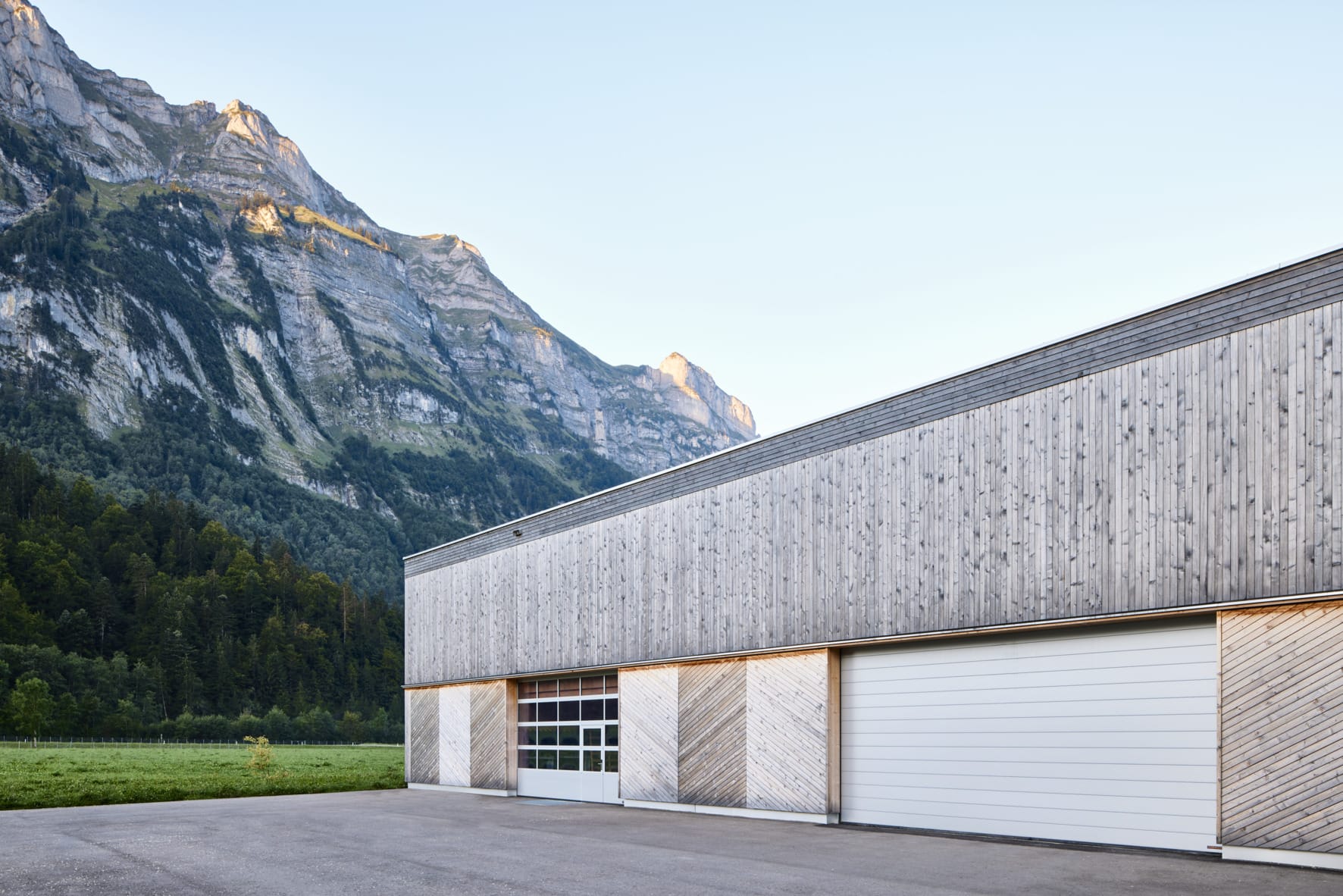 © Hörmann/Laura ThiesbrummelIm österreichischen Schnepfau im Bregenzerwald ist im Jahr 2023 der Neubau der Tischlerei Rüscher vor beeindruckender Kulisse entstanden. Die Bergketten bilden einen starken Kontrast zum orthogonalen Gebäude. Die Tore und Türen lieferte Hörmann. -