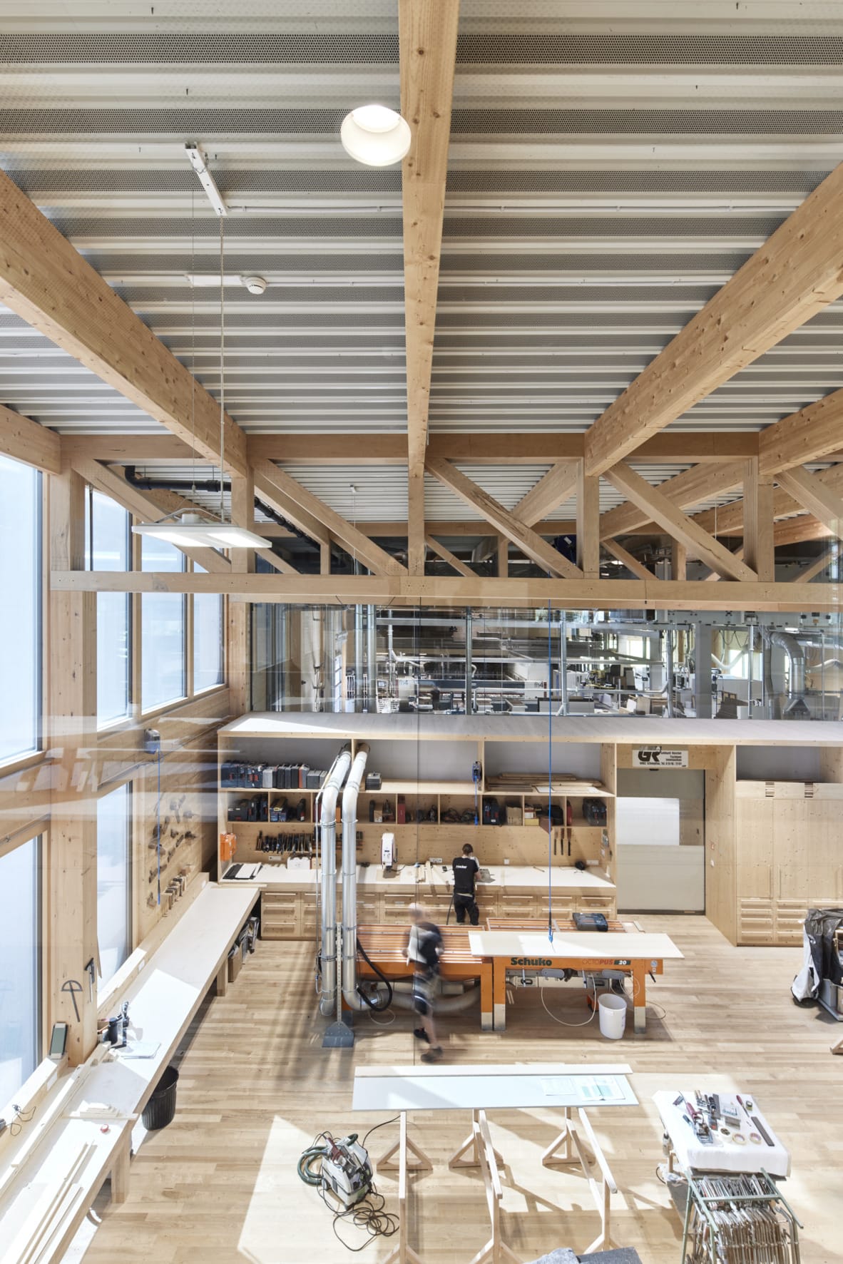 © Hörmann/Laura ThiesbrummelDie beiden Abschnitte der Halle werden durch eine Schrankwand getrennt. Holzfachwerkträger tragen das Dach der Halle. -