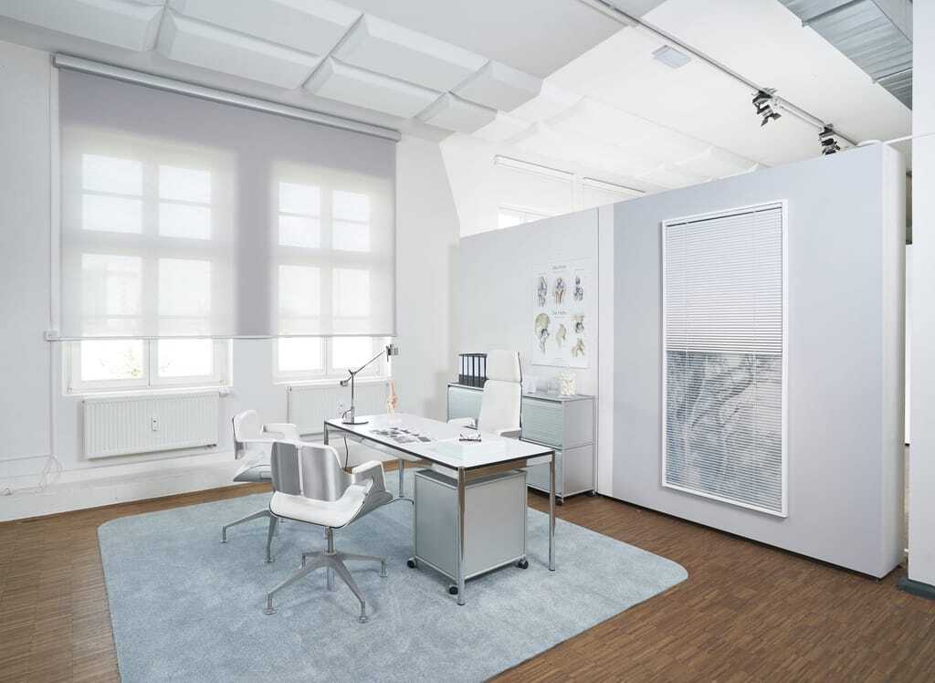 Mit Anti Viral wurde ein Lösungsansatz mit formreduzierter Einrichtung wie z. B. im Arztzimmer inszeniert, der verkabelte Motorisierungslösungen im Gegensatz zu akkubetriebenen aufzeigt. Eine Ergänzung ist der Einsatz eines antiviralen Gewebes, der den rein nutzenorientierten Lösungsansatz unterstreicht. - © Hunter Douglas