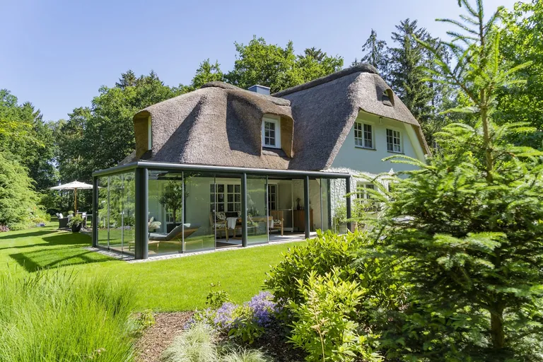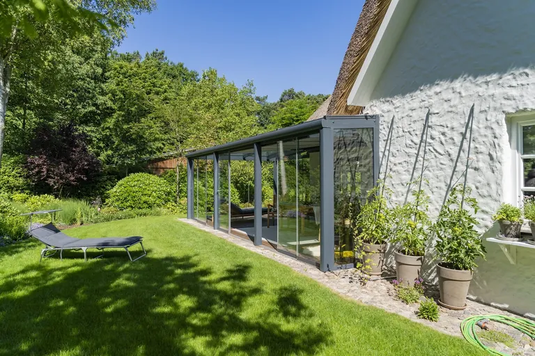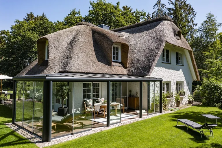 "Für die Terrasse ihres Reetdachhauses wünschten sich die Bauherren einen Glasraum als Witterungsschutz gegen Wetterextreme, der ihnen Transparenz und Flexibilität ermöglicht", heißt es in einer Projektbeschreibung von Sunflex.
